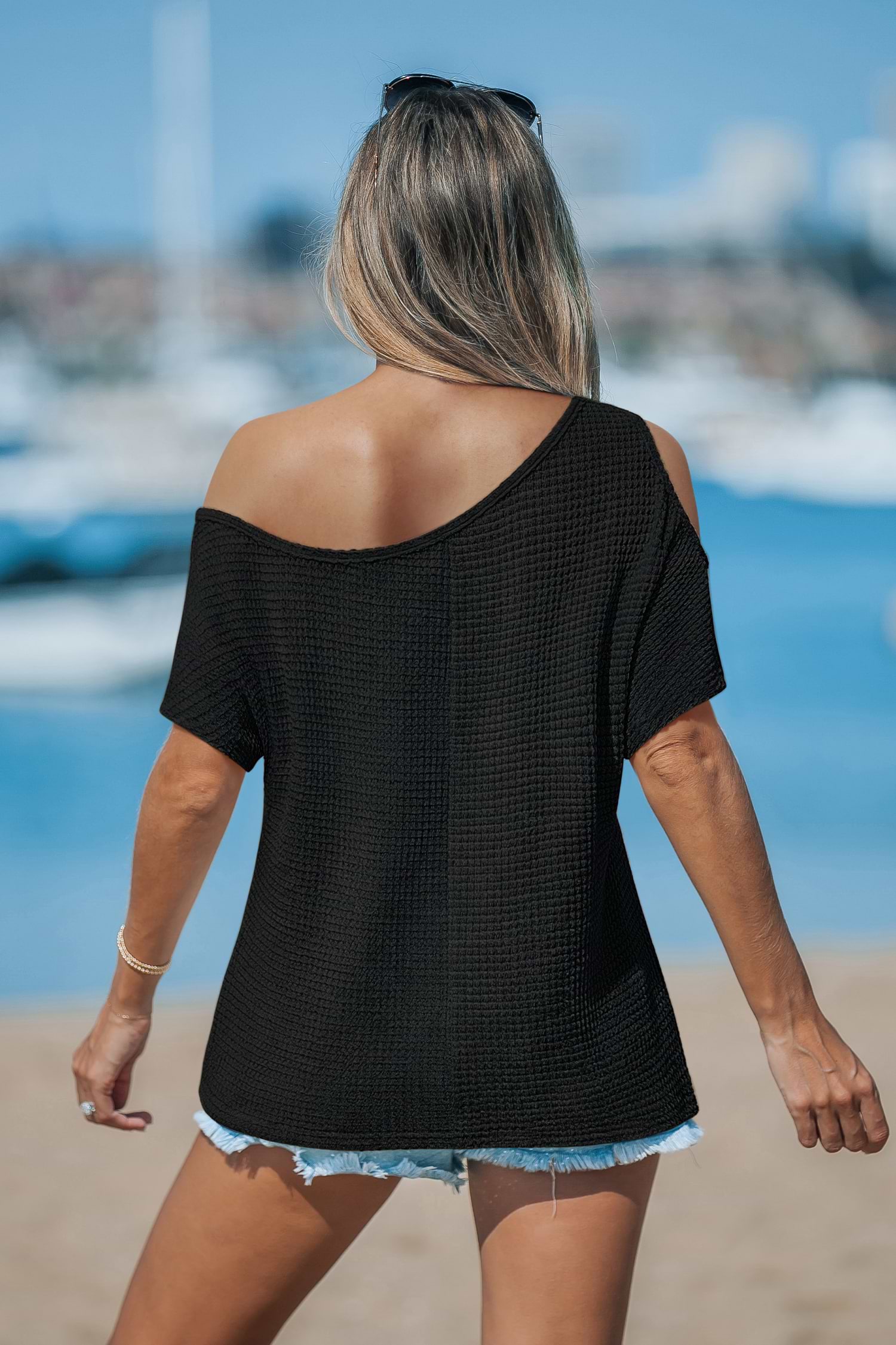 De Always Grounded Black Top combineert een subtiele edge met zacht comfort! De asymmetrische halslijn met O-ringdetail en korte mouwen zorgen voor een relaxte maar opvallende look.