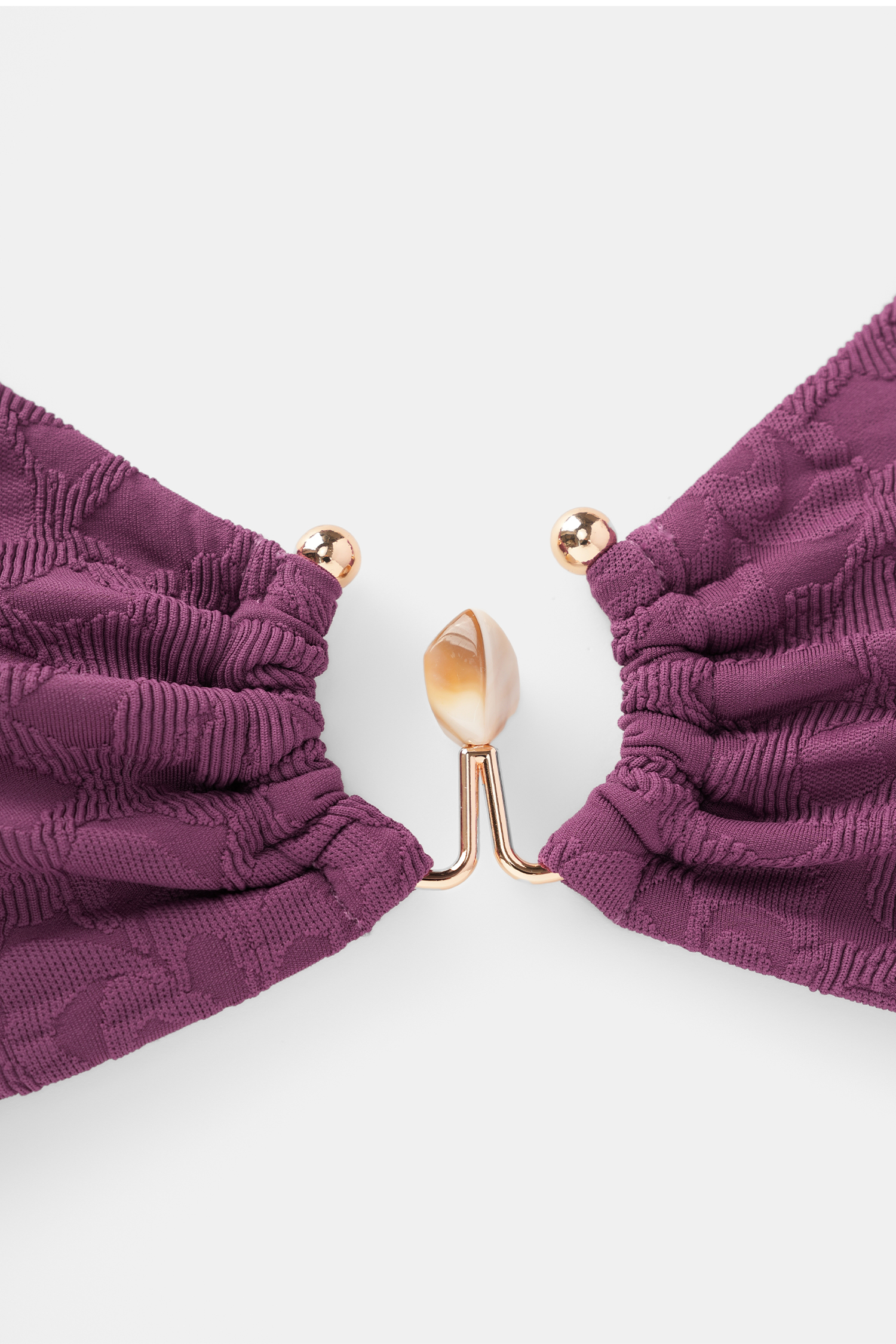 De Amethyst Spark Purple bikiniset is een oogverblindende keuze voor wie graag schittert! Met een diep decolleté en verstelbare bandjes biedt hij een flatterende pasvorm en medium ondersteuning voor de buste. Het hoog getailleerde broekje met een halflange uitsnijding en matige bedekking van de billen maakt de look compleet, perfect voor iedereen die graag geniet van een beetje plezier aan het water.