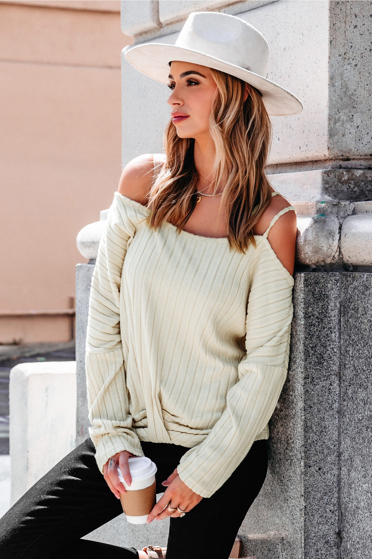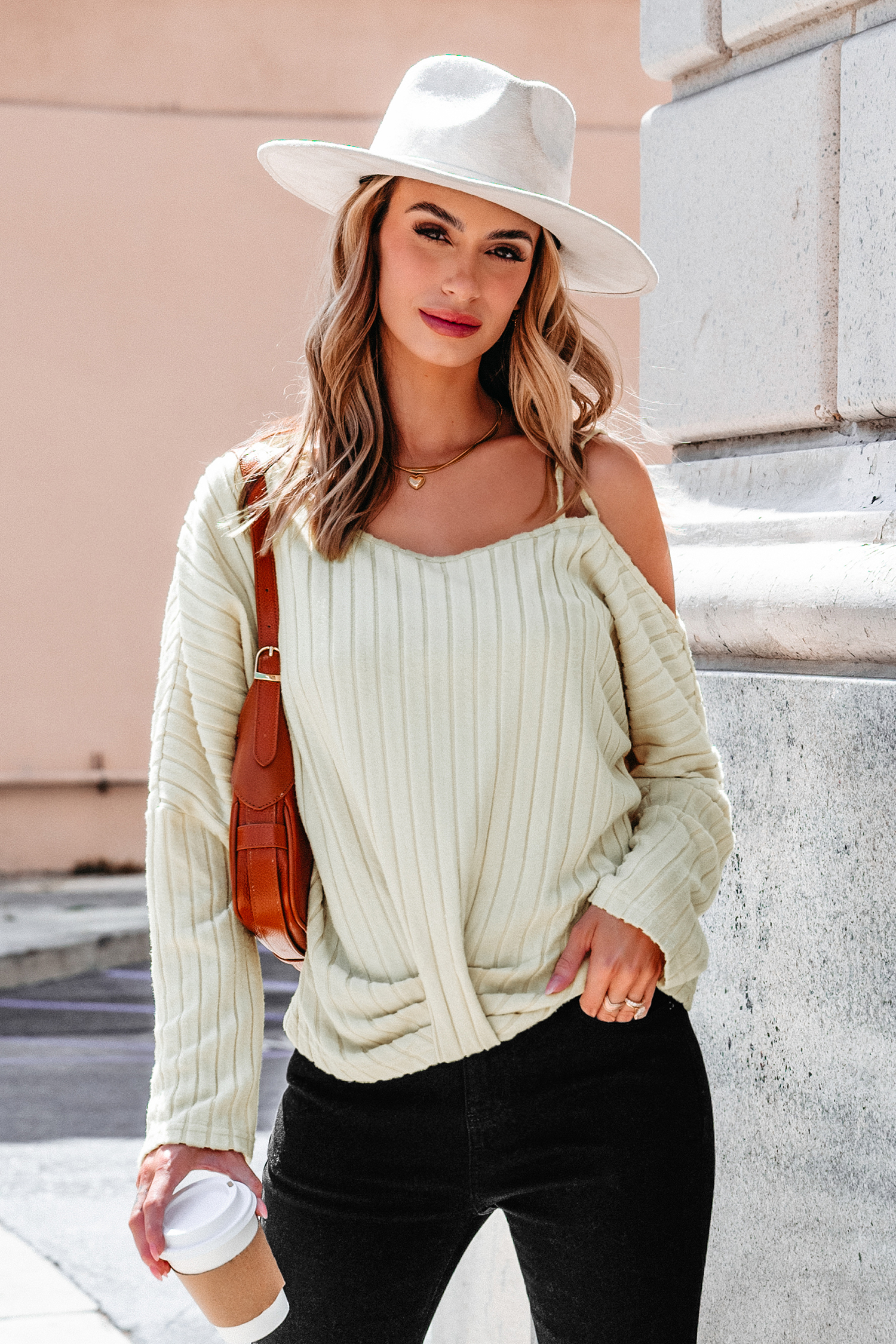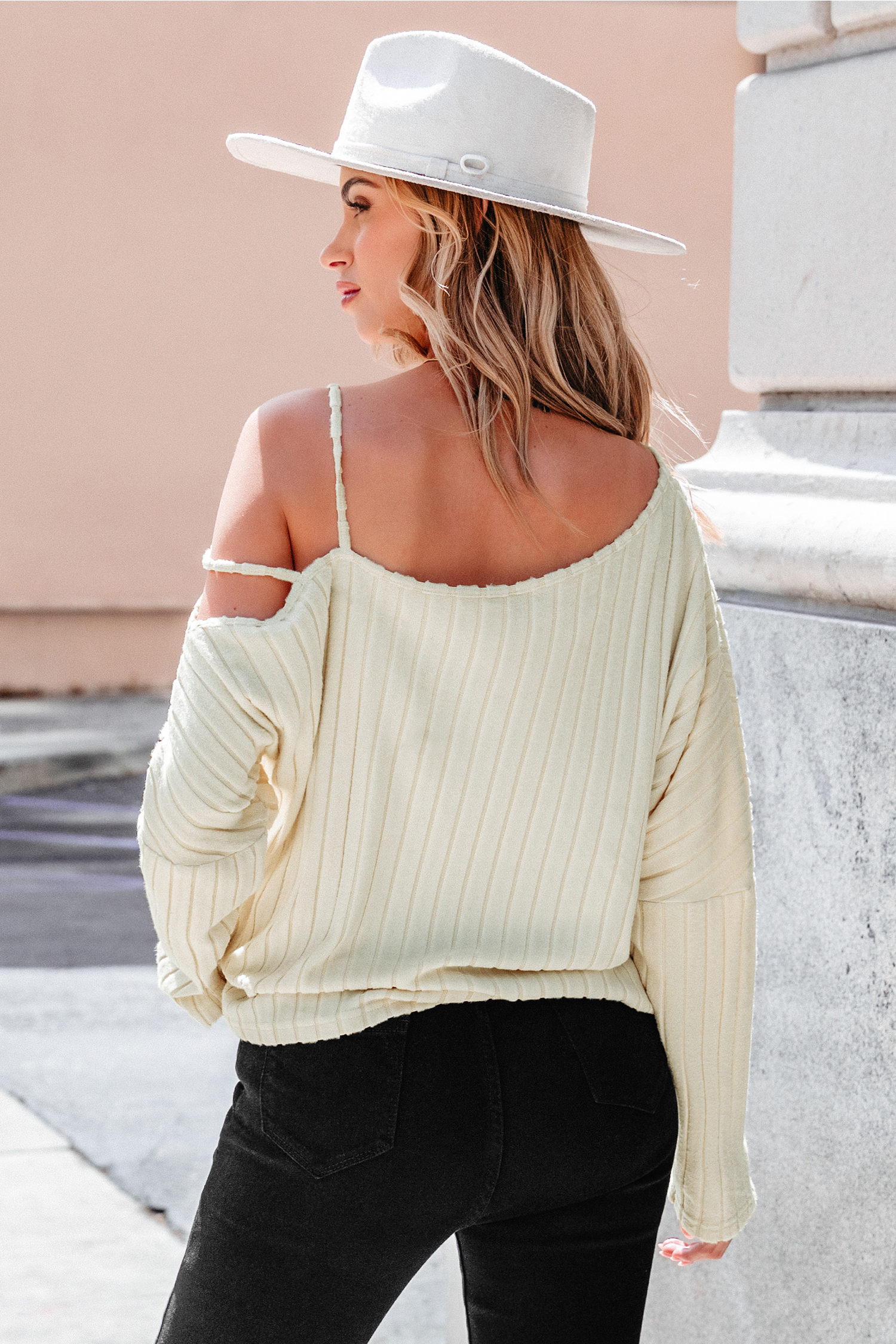 Abrikoos geribbelde asymmetrische halsuitsparing top met lange mouwen