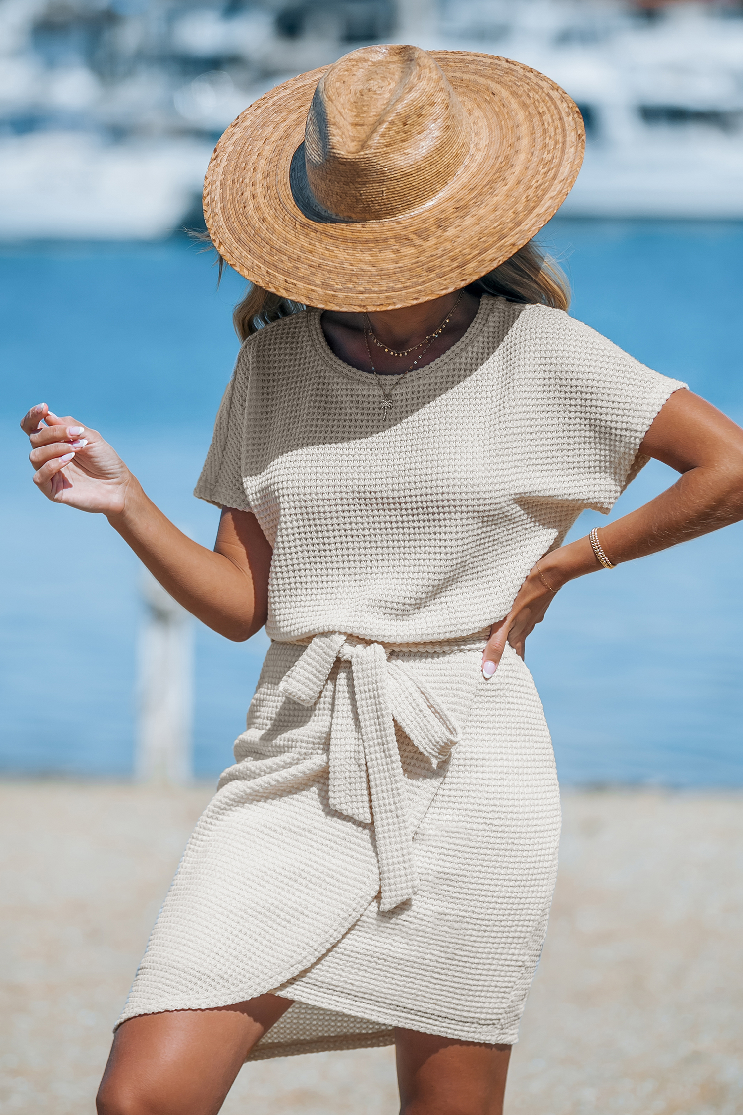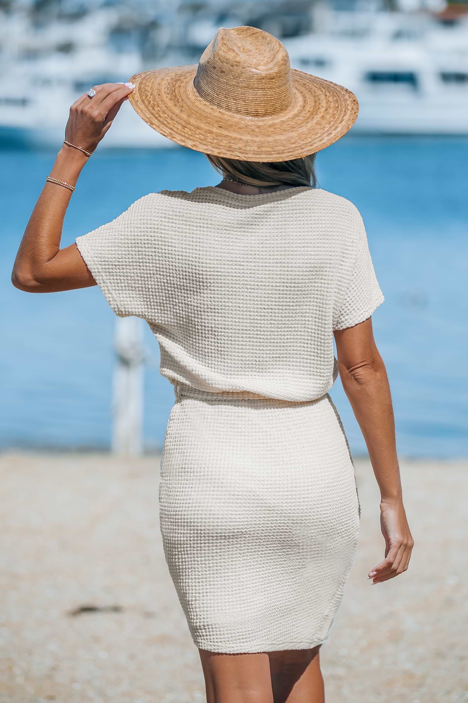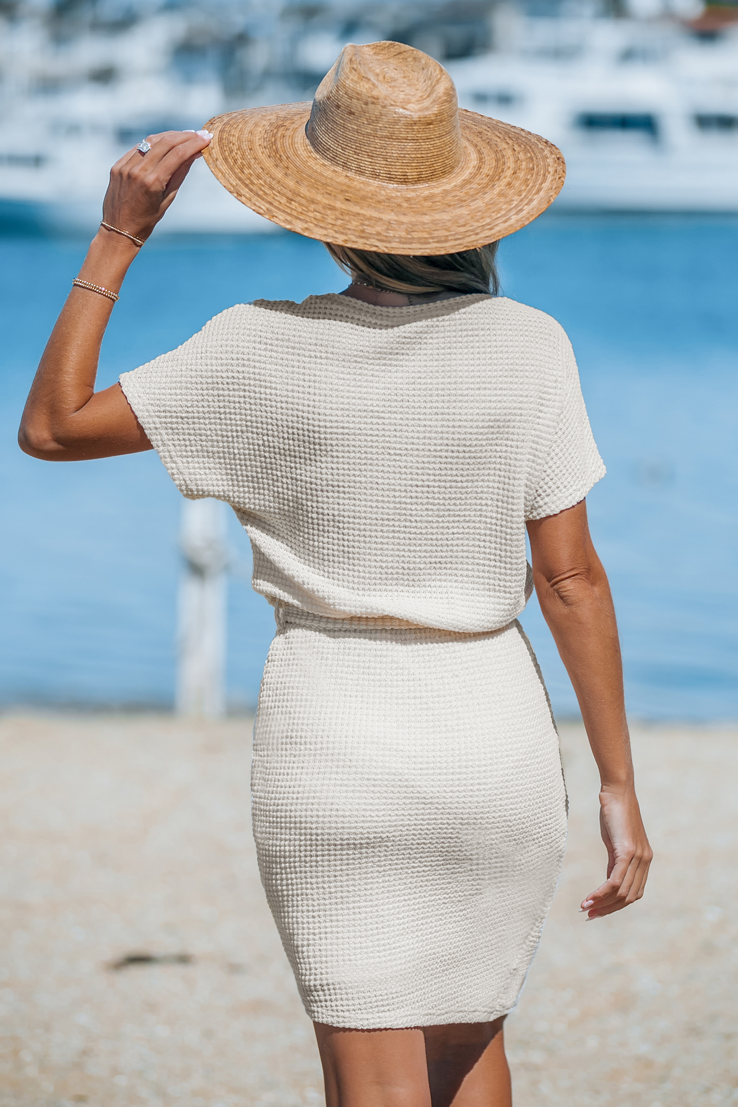 Beige mini-jurk met ronde hals korte mouwen en asymmetrische zoom