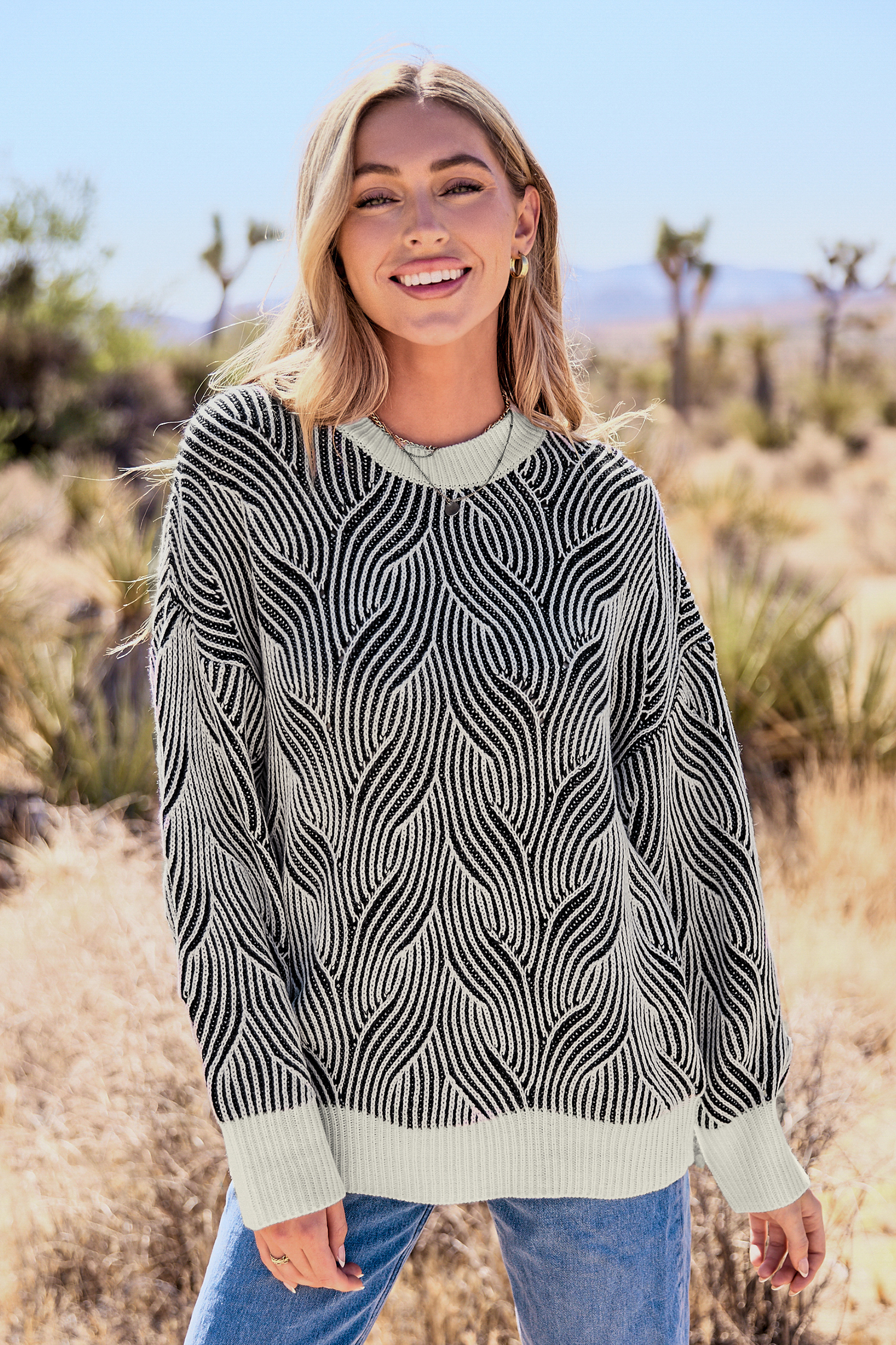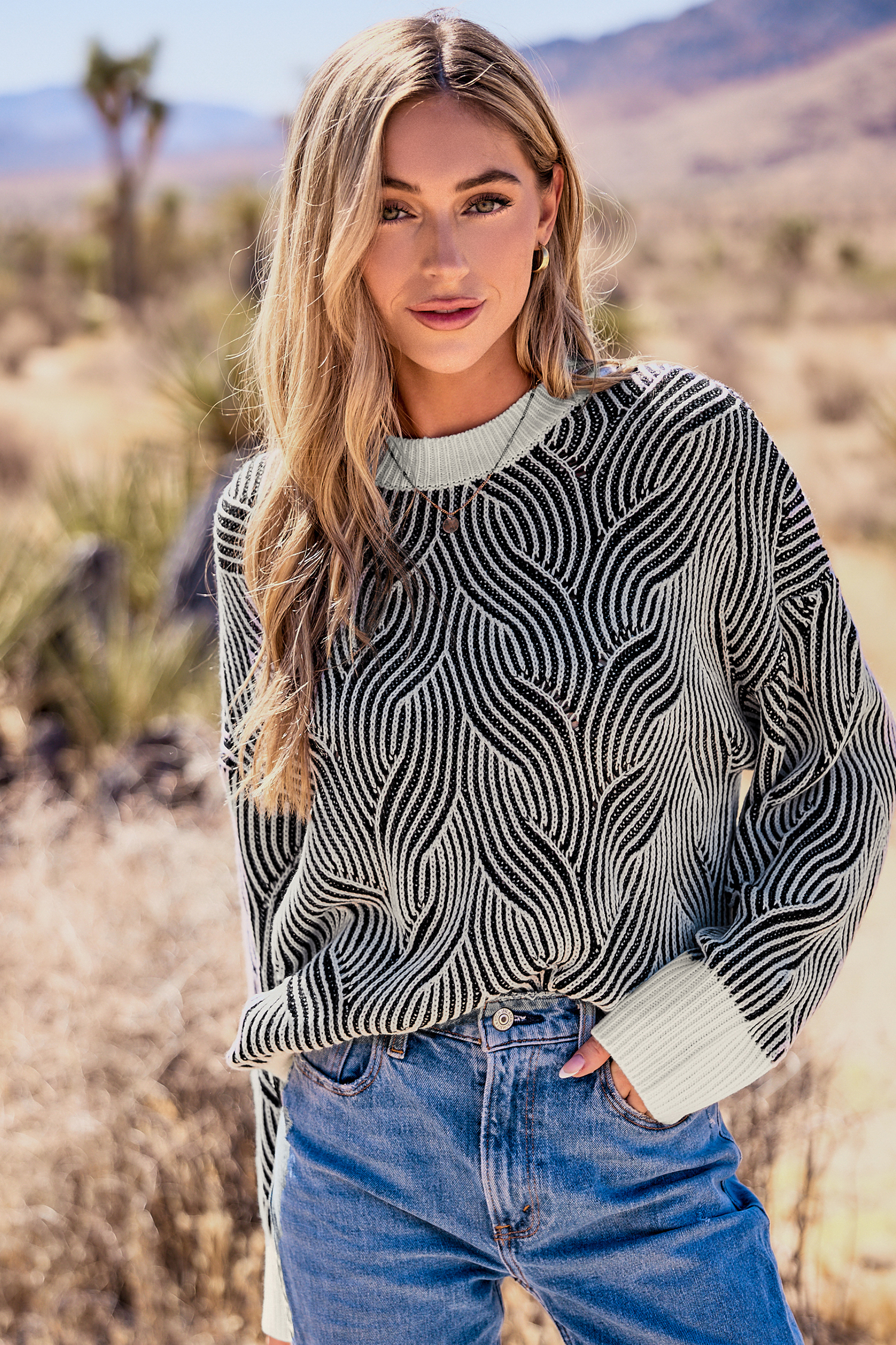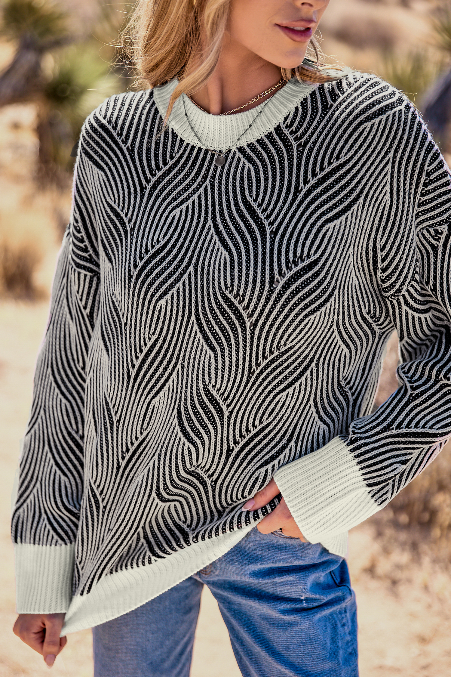 Zwart-witte gevlochten ronde hals trui met lange mouwen