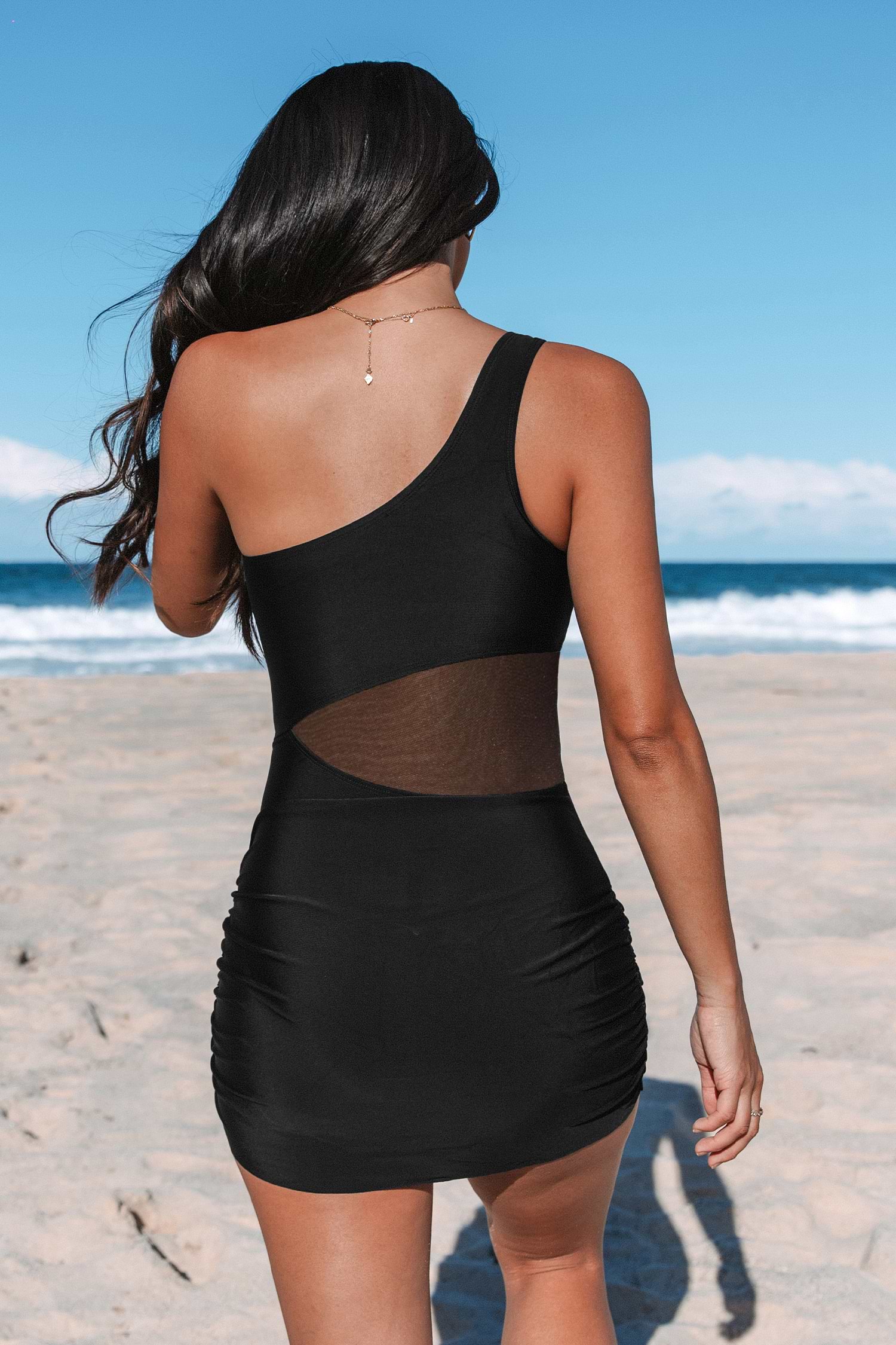 ThuisZwarte asymmetrische zwemjurk met mesh taille