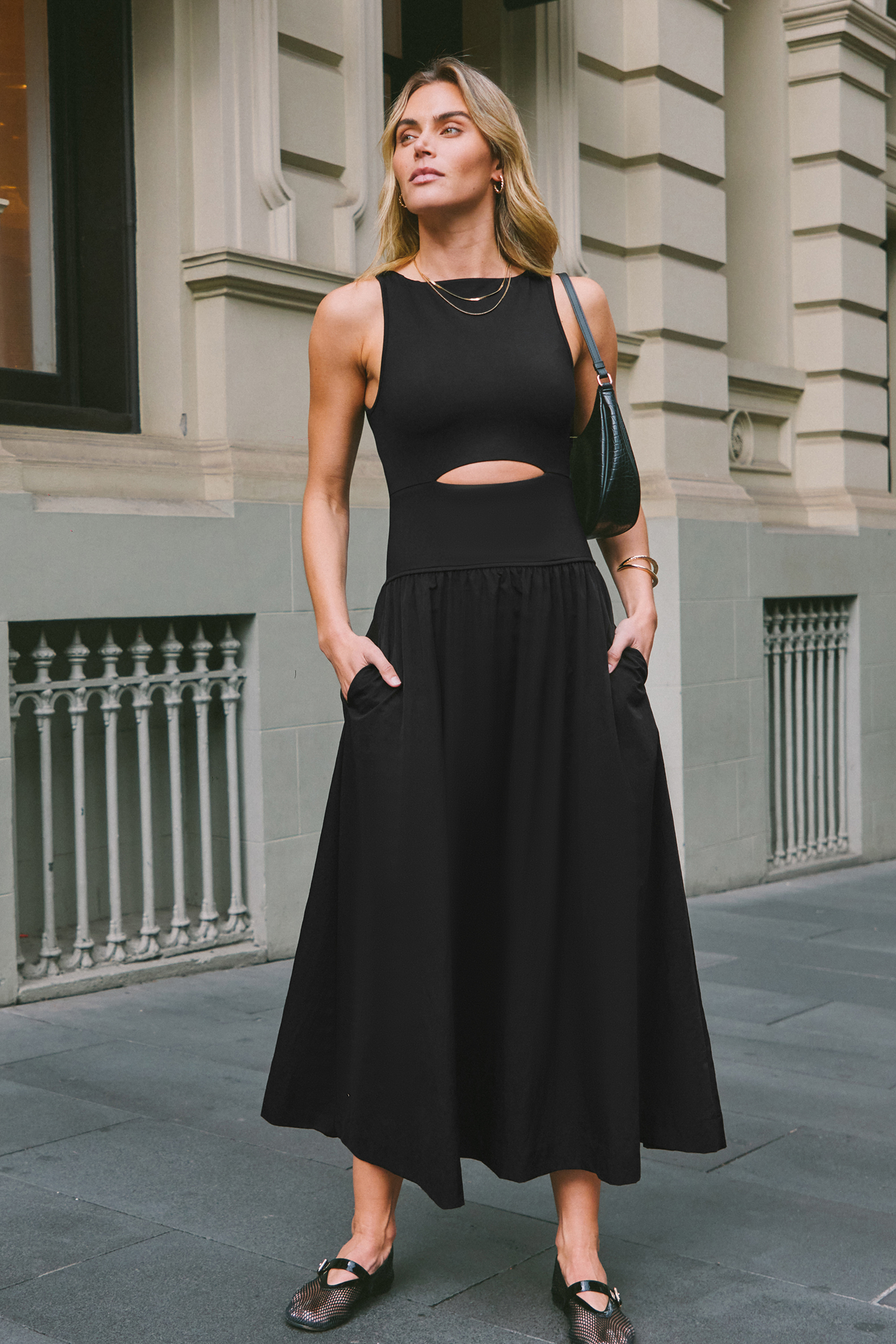 Zwarte mouwloze maxi-jurk met boothals en uitsnijding