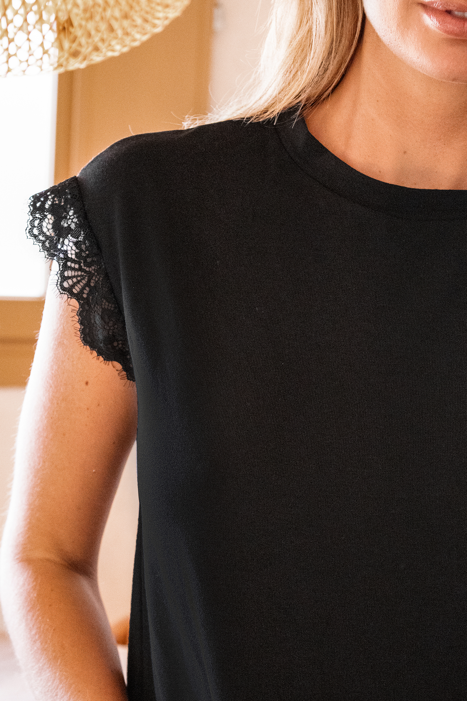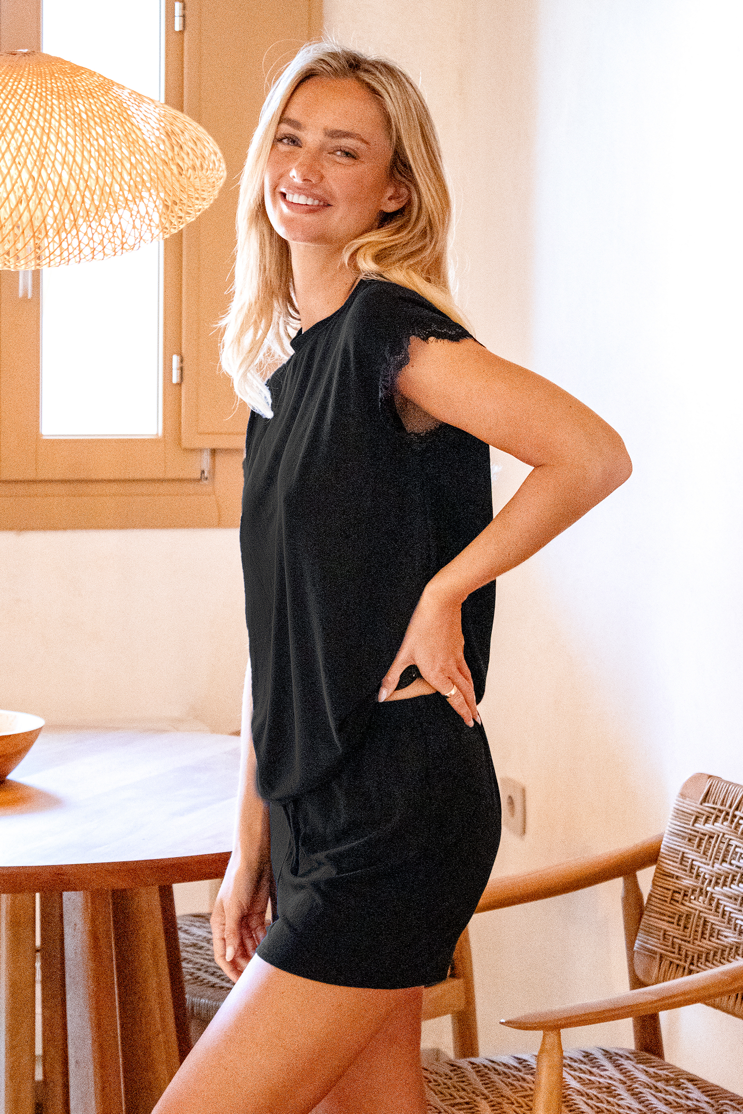 ThuisZwarte kanten T-shirt en shorts pyjamaset