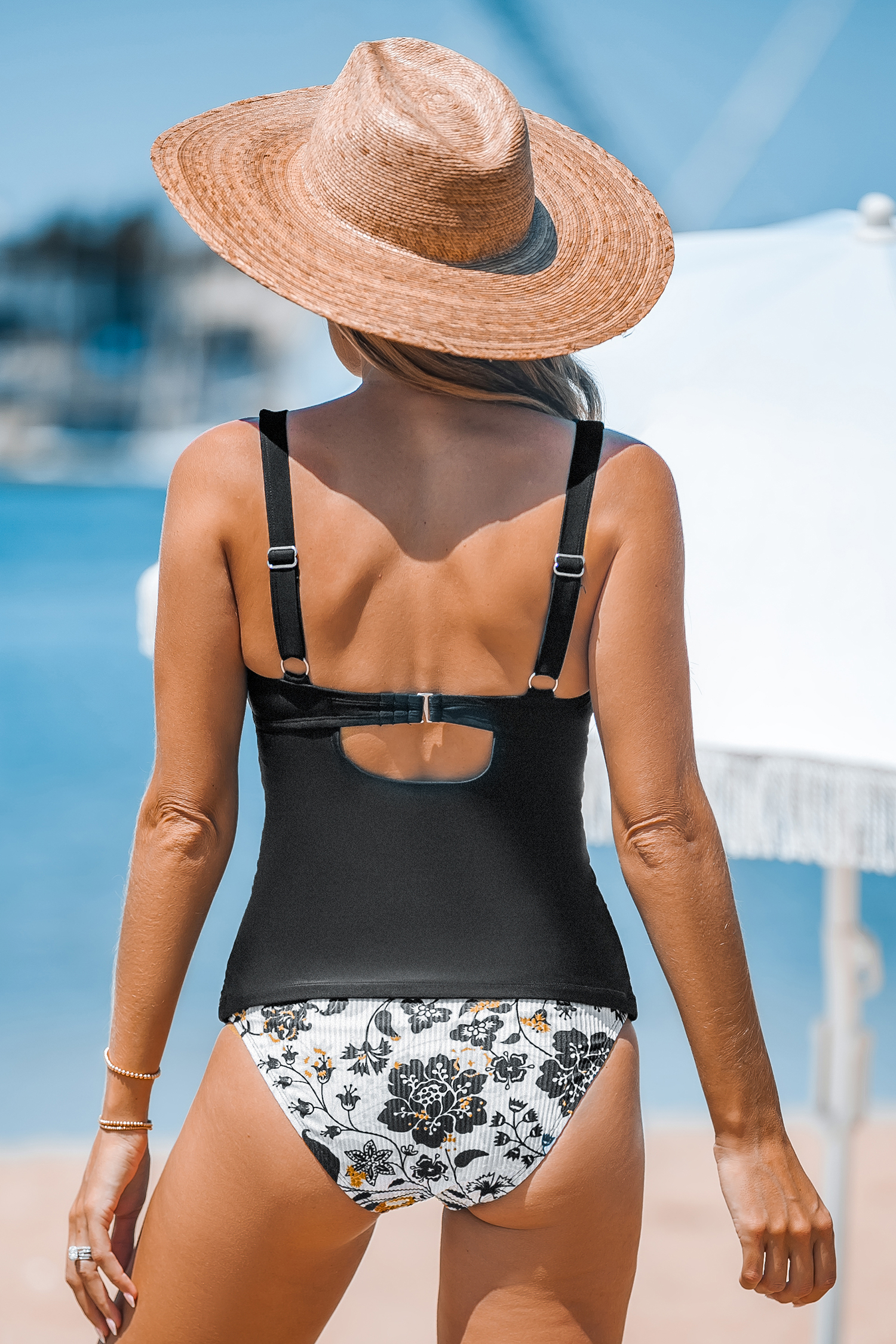 Zwarte tankinitop met V-hals en standaard broekje met bloemenprint