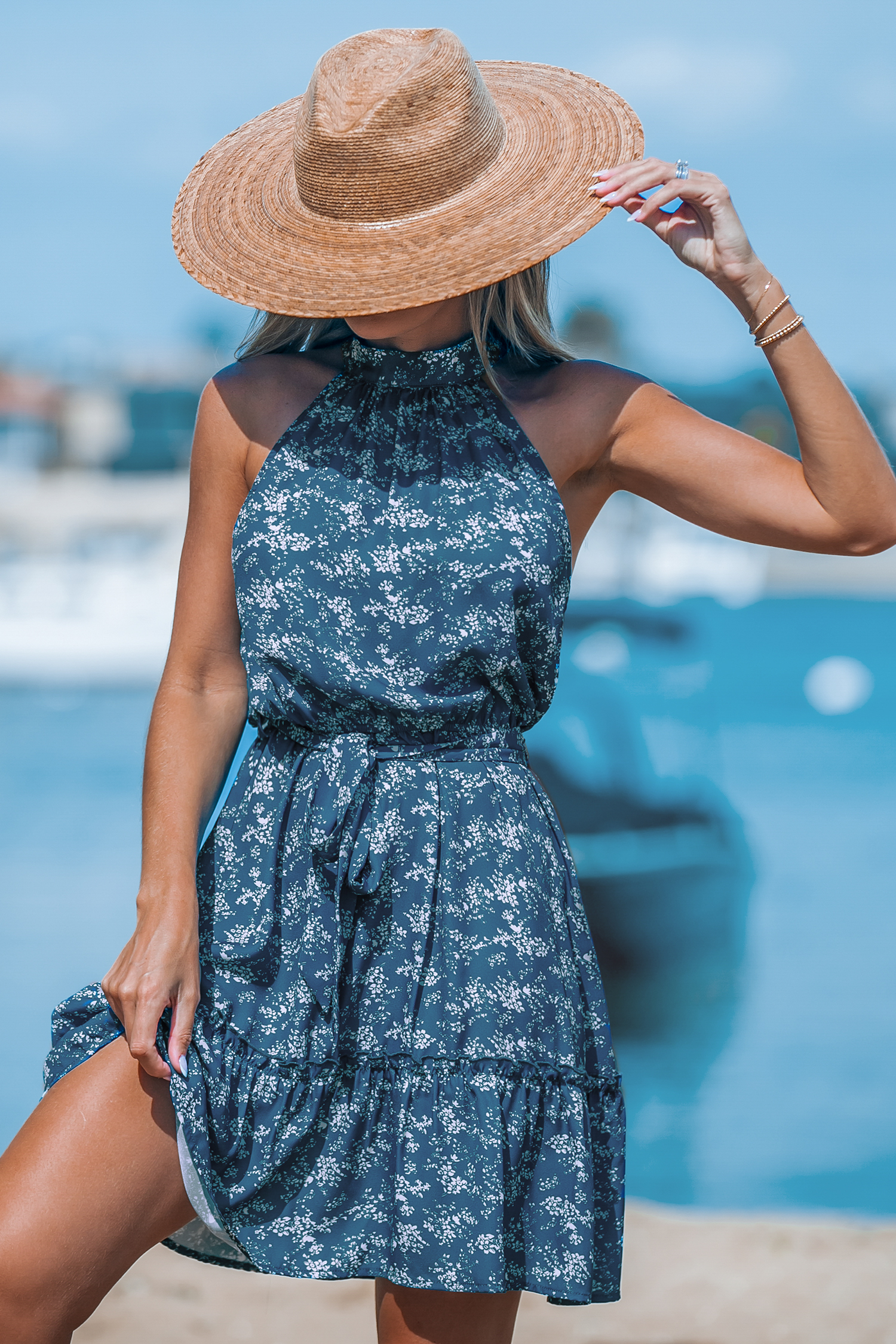 ThuisBlauwe mini-jurk met halternek en strikceintuur