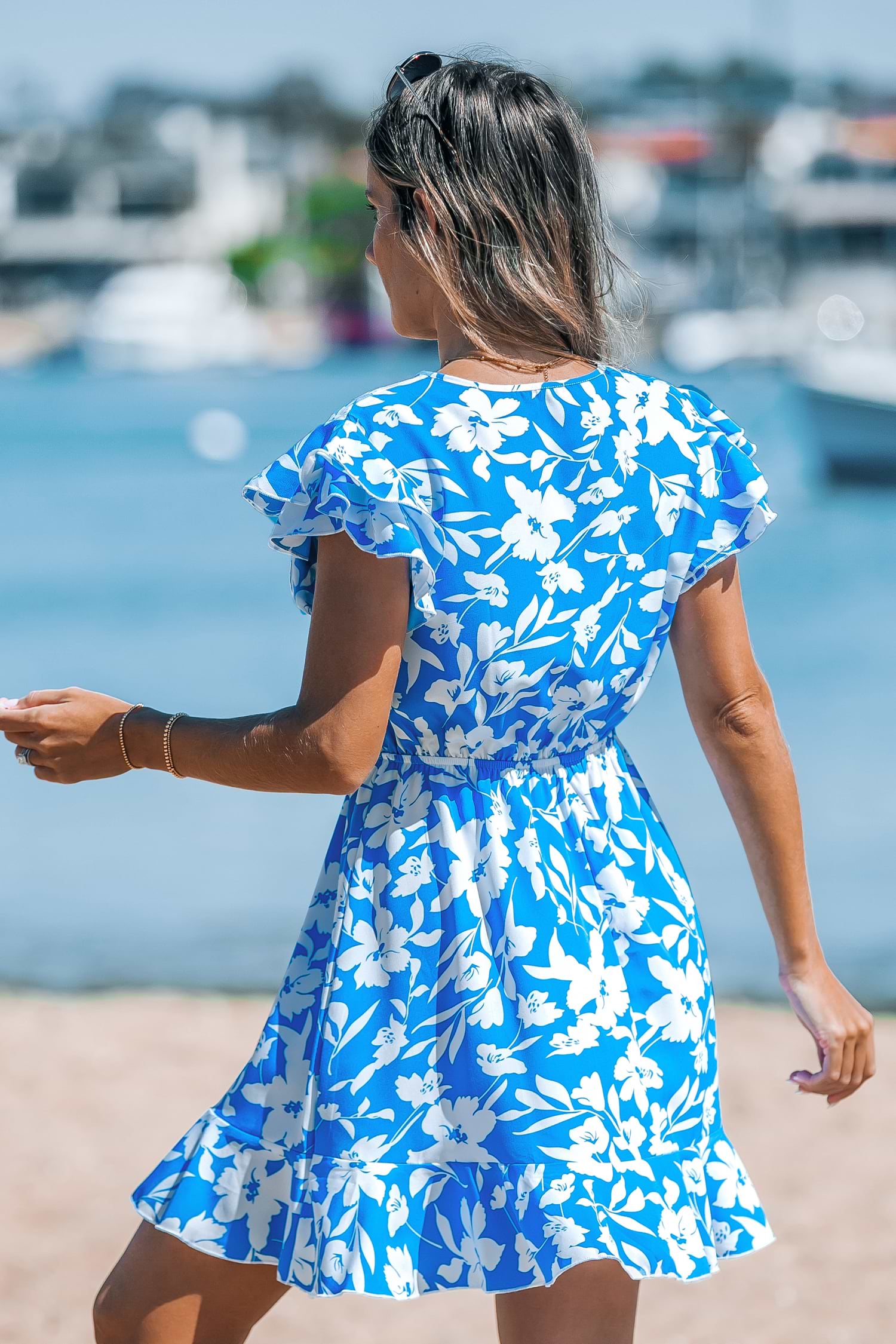 Blauwe gebloemde mini-jurk met gelaagde ruches aan de mouwen