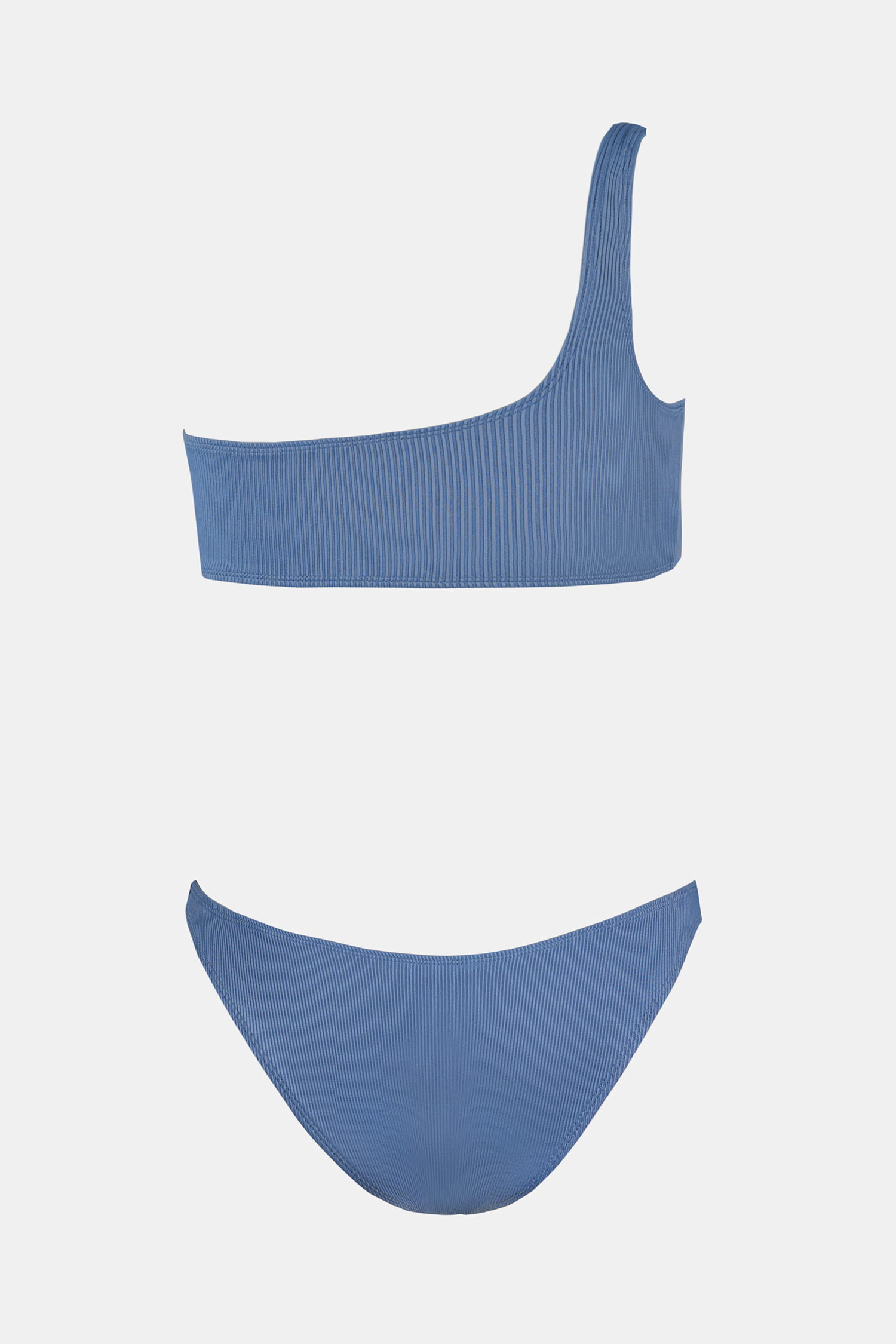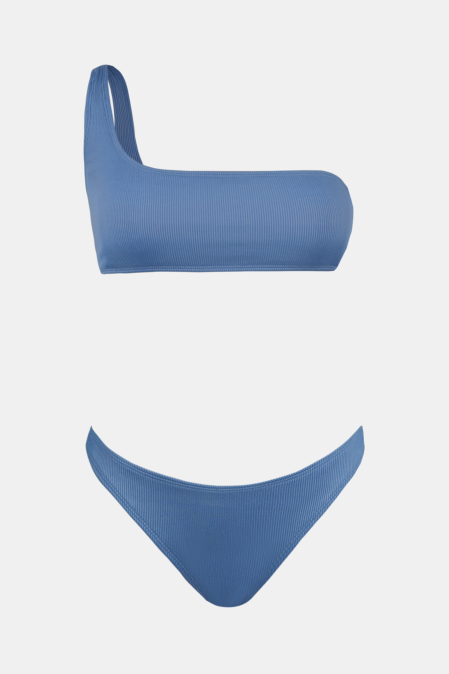 Blauwe bikinitop met één schouder en laag uitgesneden broekje