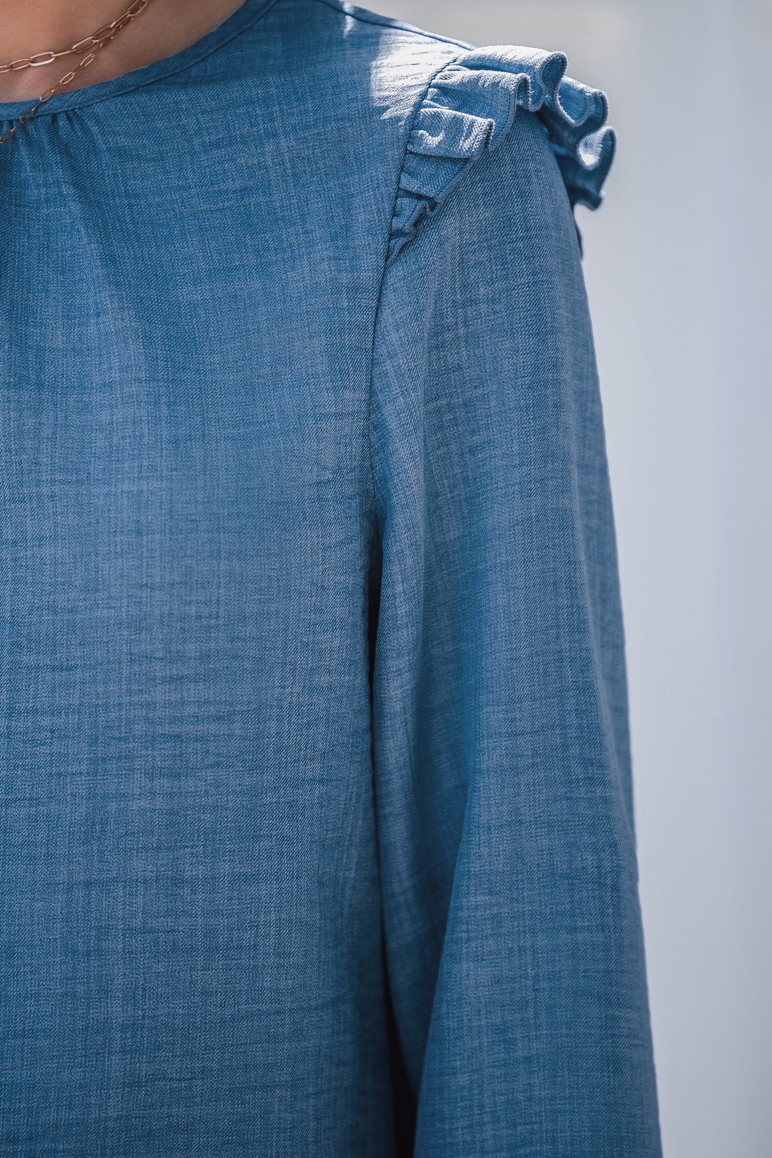 ThuisBlauwe ronde hals gerimpelde schouder blouse met lange mouwen