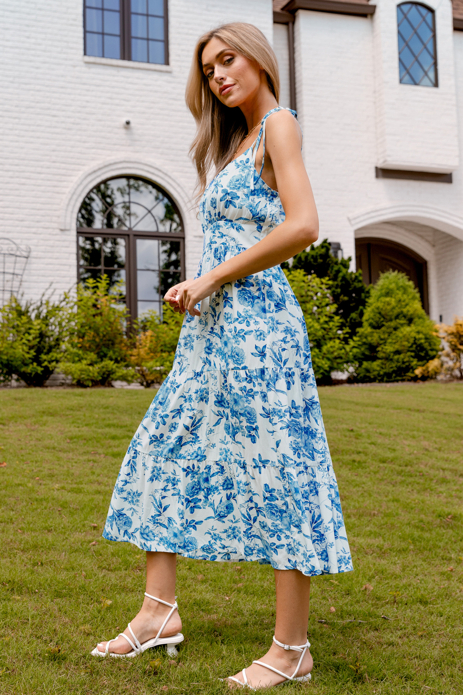Blauw-witte bloemen midi-jurk met vierkante hals en strikband
