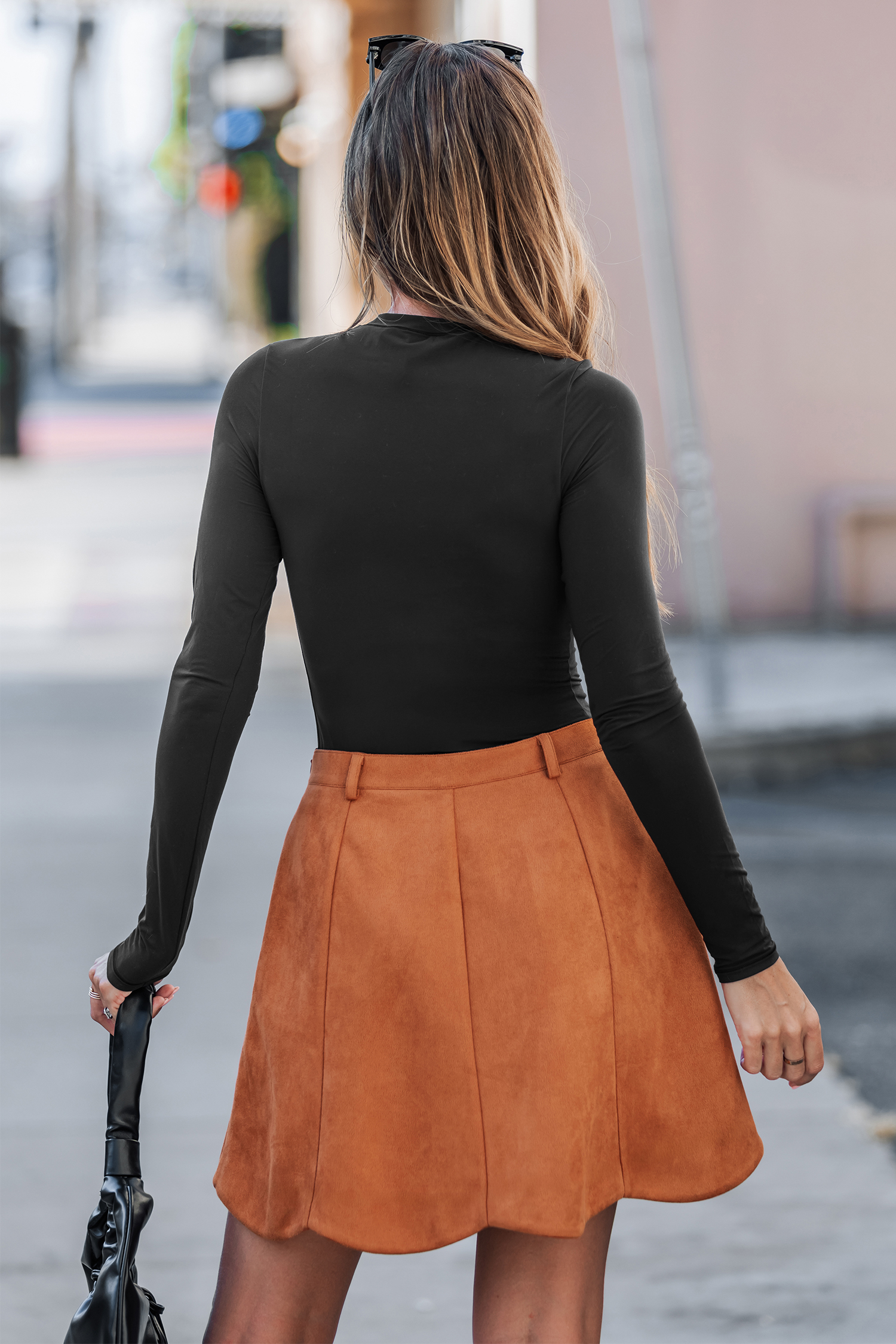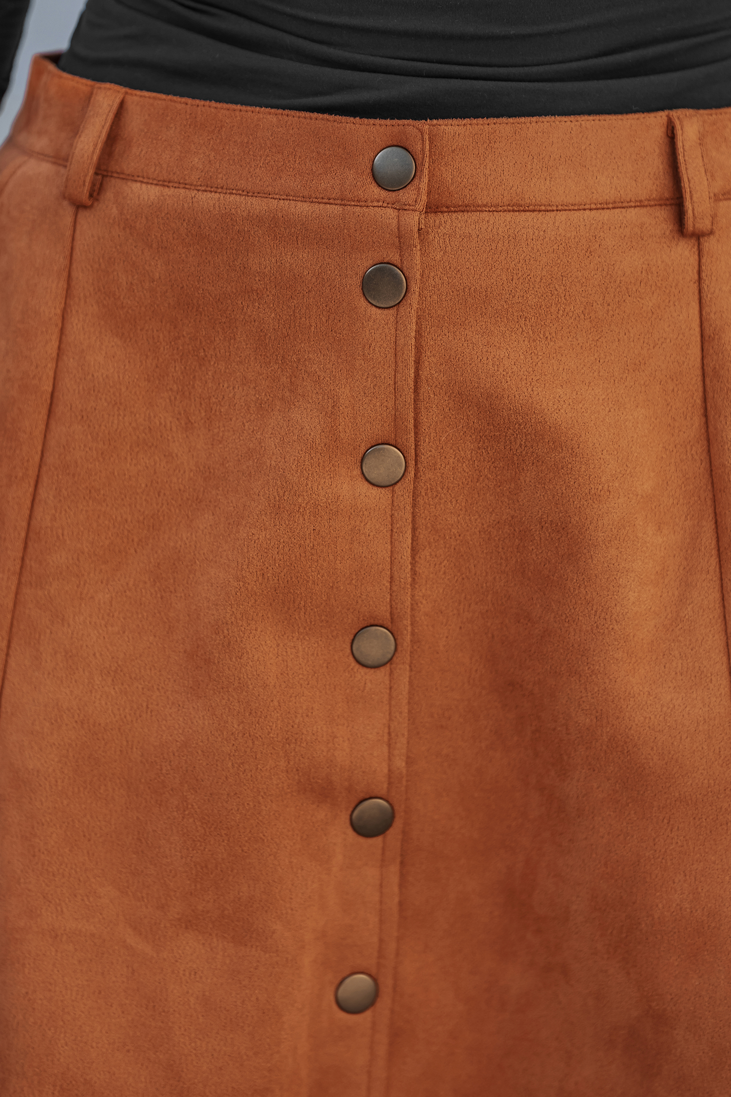 De Cider & Spice Orange Minirok brengt gezellige herfstvibes met een speelse twist! Het knoopdetail aan de voorkant en de minilengte maken hem speels en leuk, perfect om te combineren met een panty voor extra warmte.