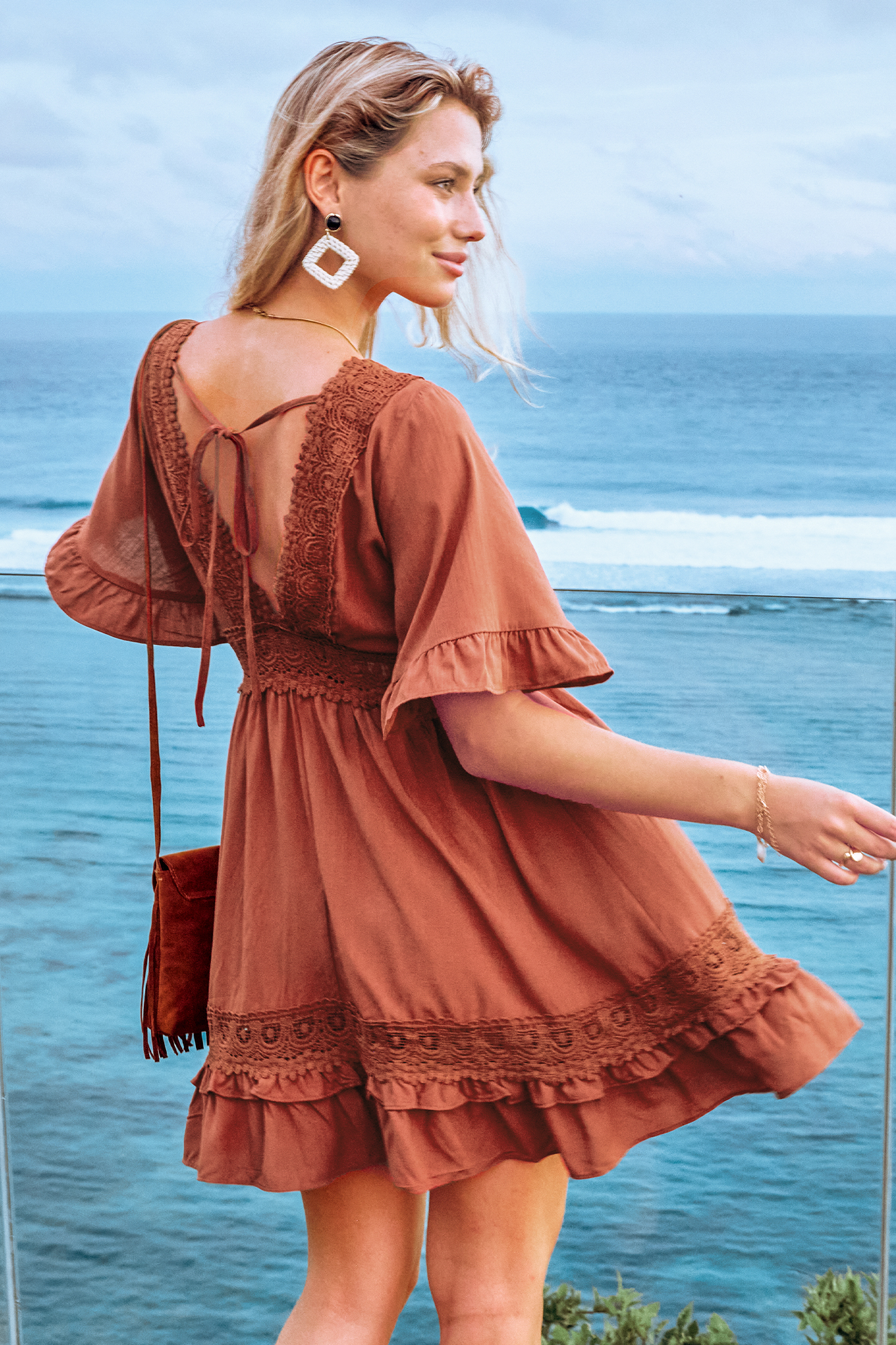 ThuisKoraalrode korte mouw geplooide mini-jurk
