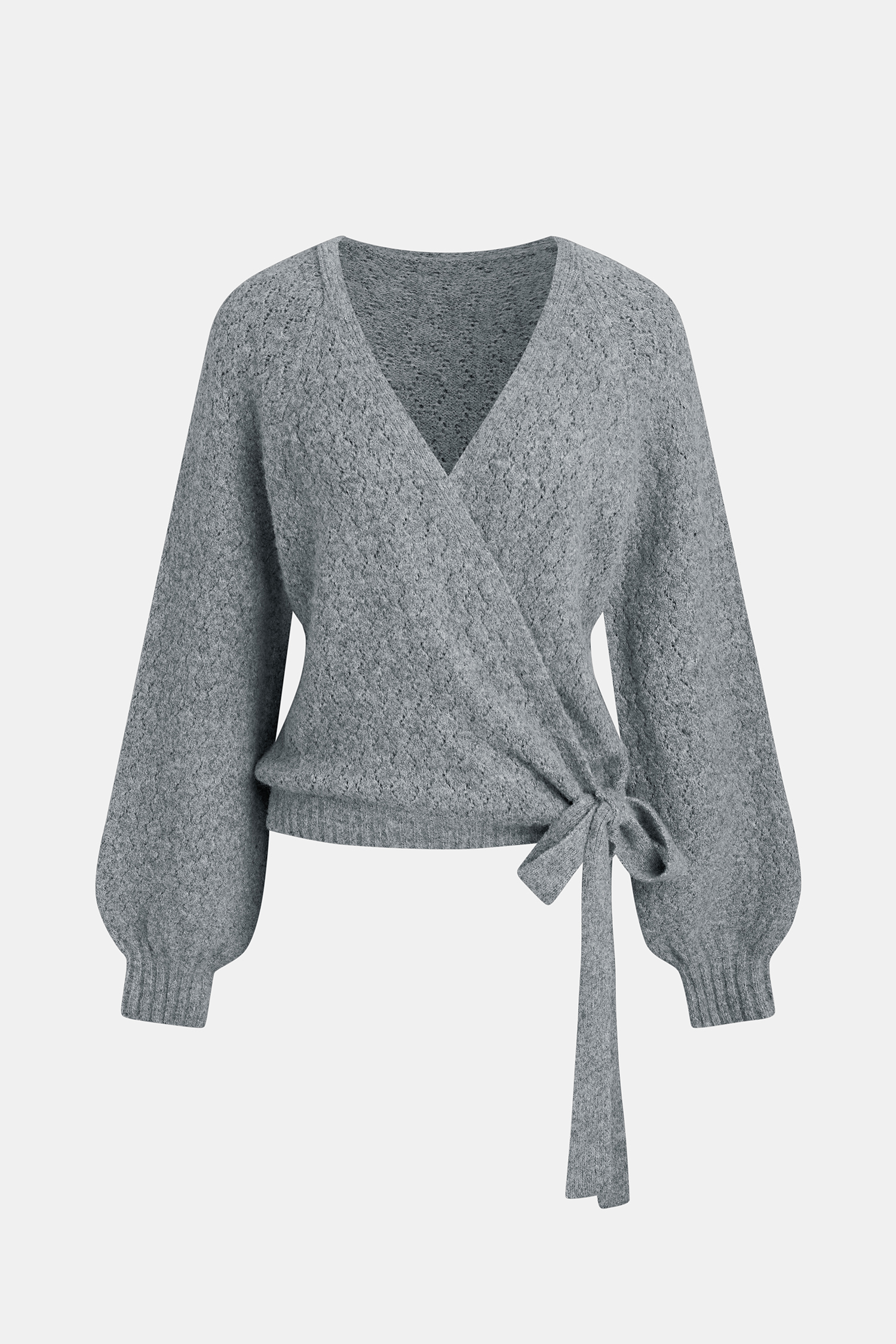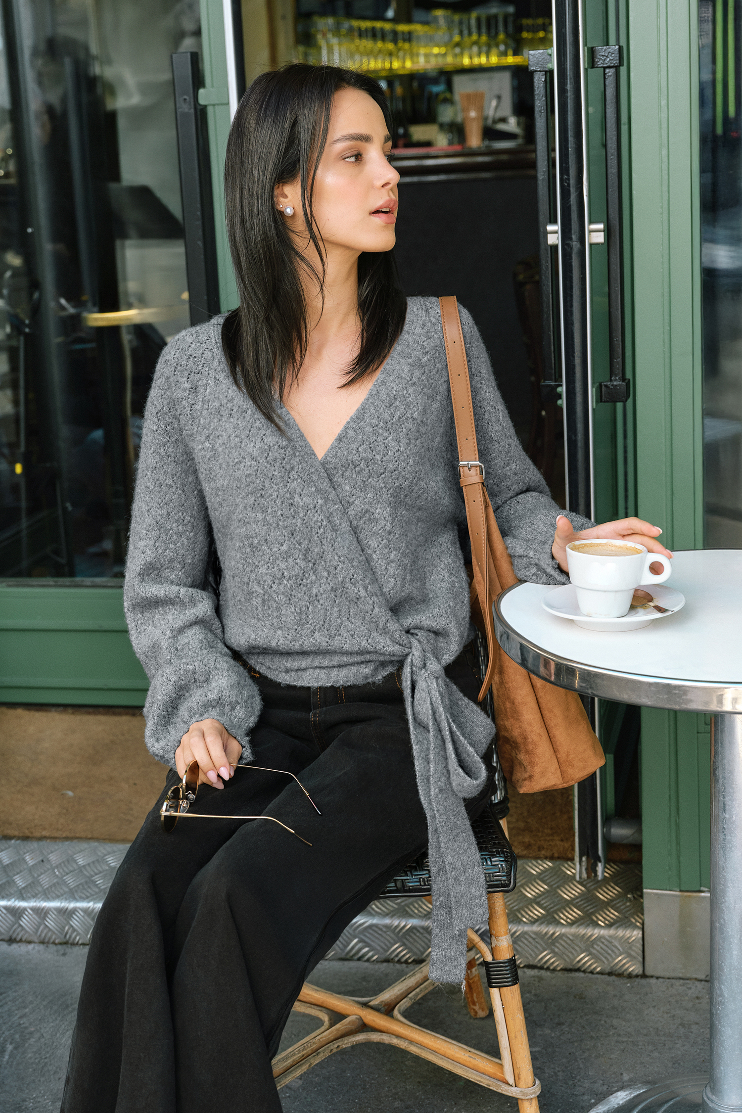 De Falling For You Grey Sweater is gemaakt voor gezellige momenten en een elegante stijl! Een overslagkraag, lange mouwen en een strikceintuur in de taille maken deze klassieke look compleet.