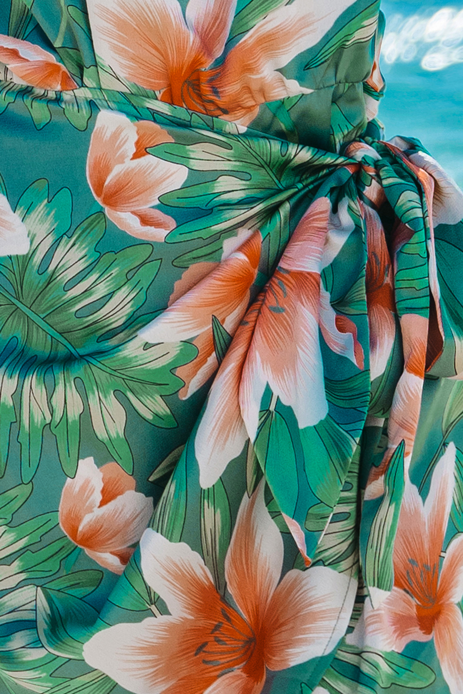 Groen en roze tropische mini-jurk met wikkelrok en één schouder