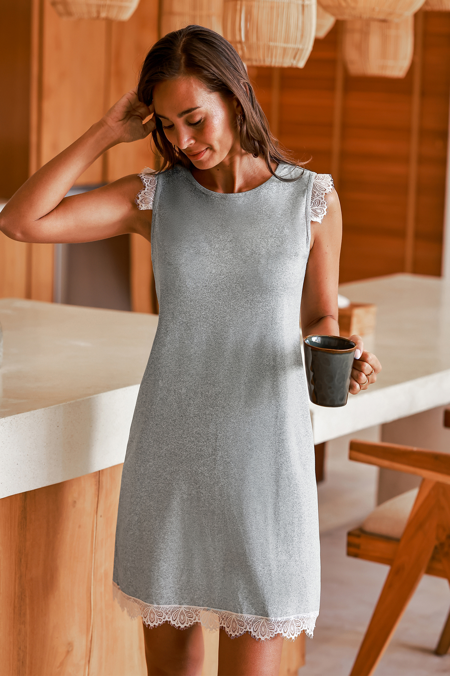 ThuisGrijze jersey witte kanten nachtjapon