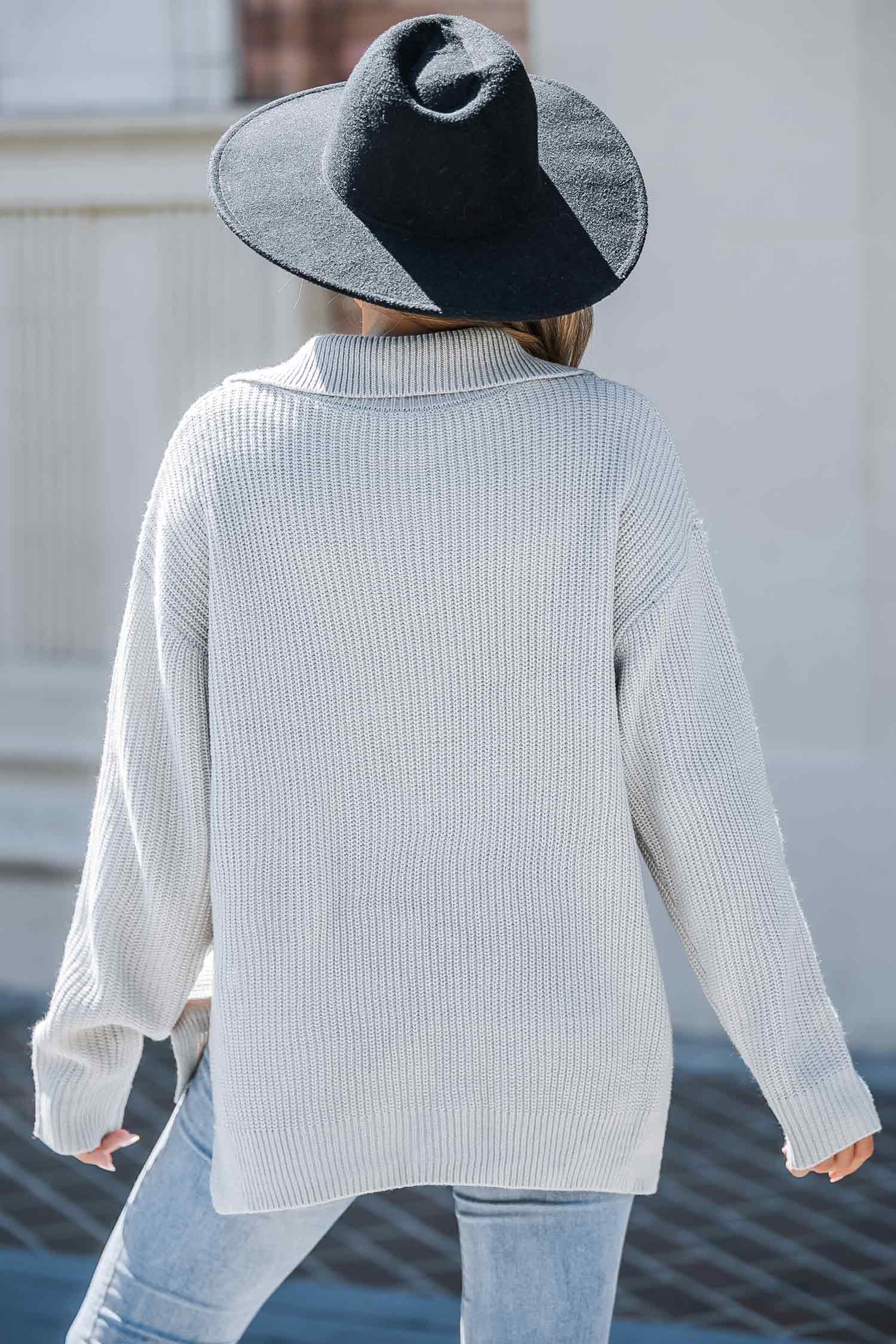 • Grijze gebreide trui met kraag en gedeeltelijke rits