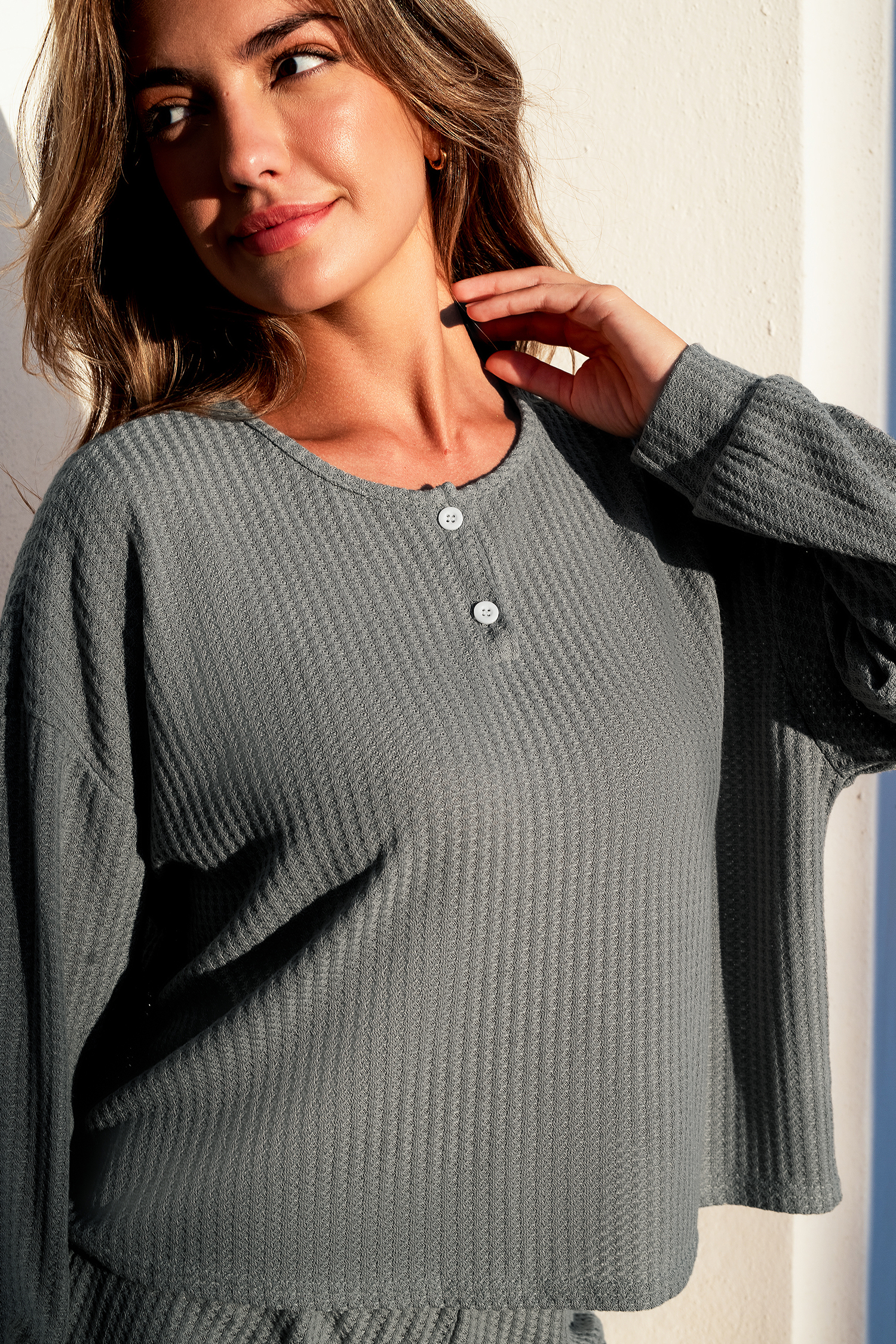Grijze wafelgebreide pyjamaset met lange mouwen en korte broek