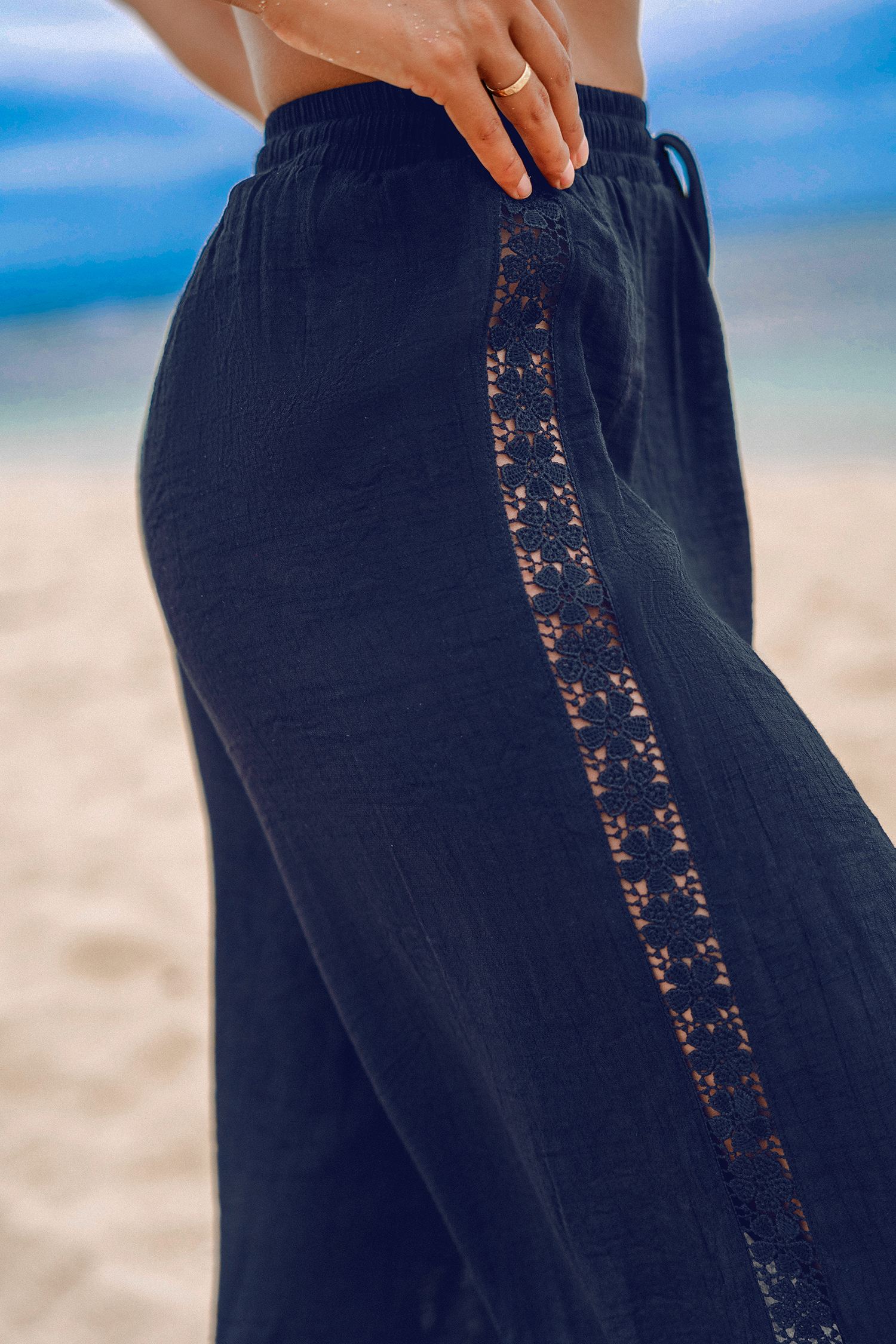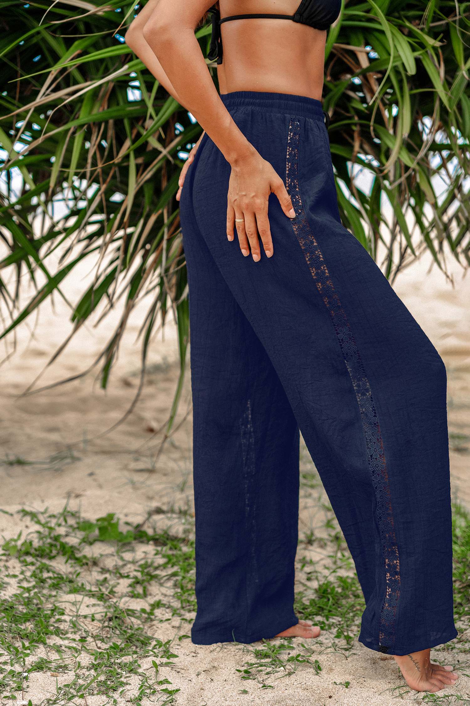 Marineblauwe cover-upbroek met elastische taille en kanten paneel