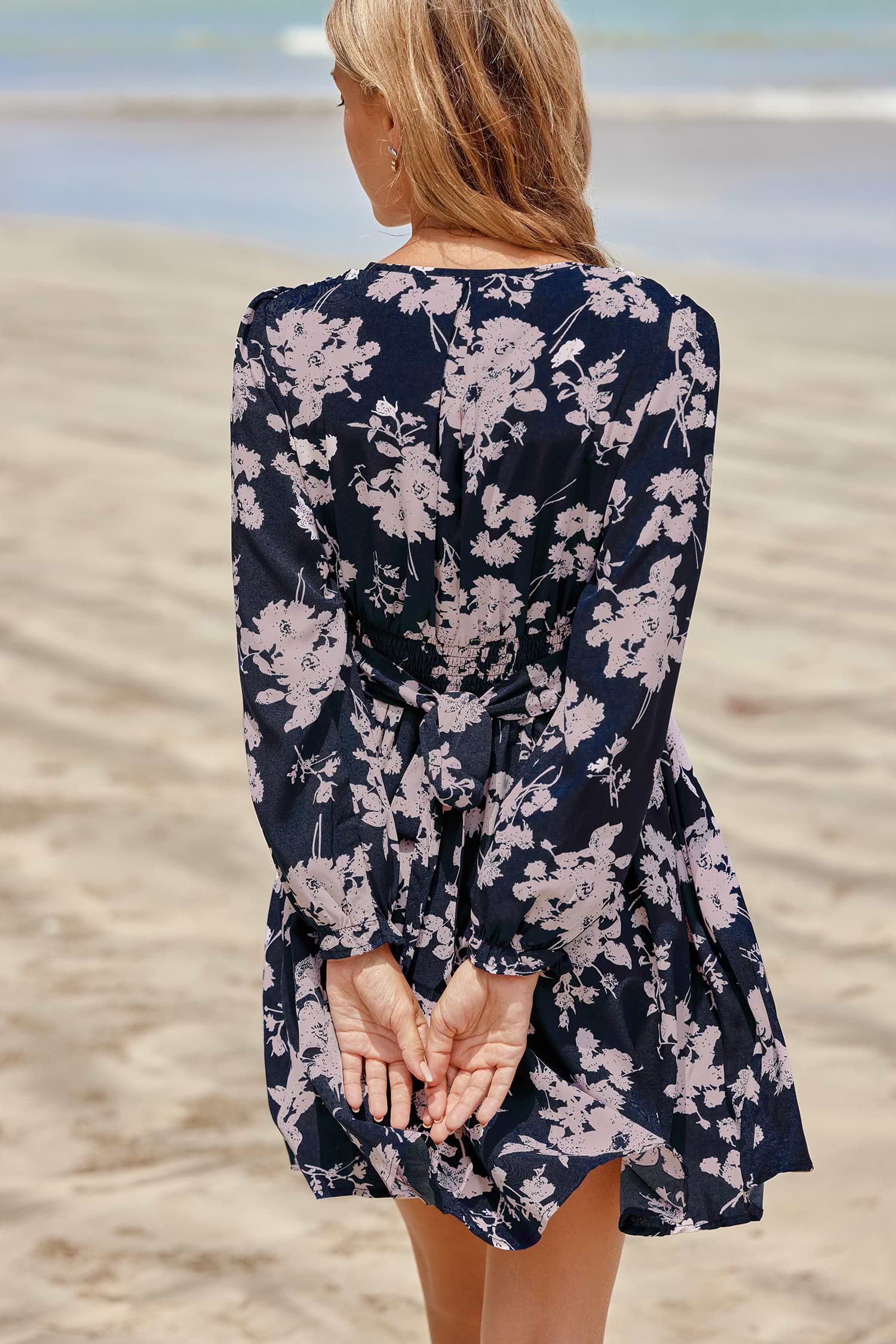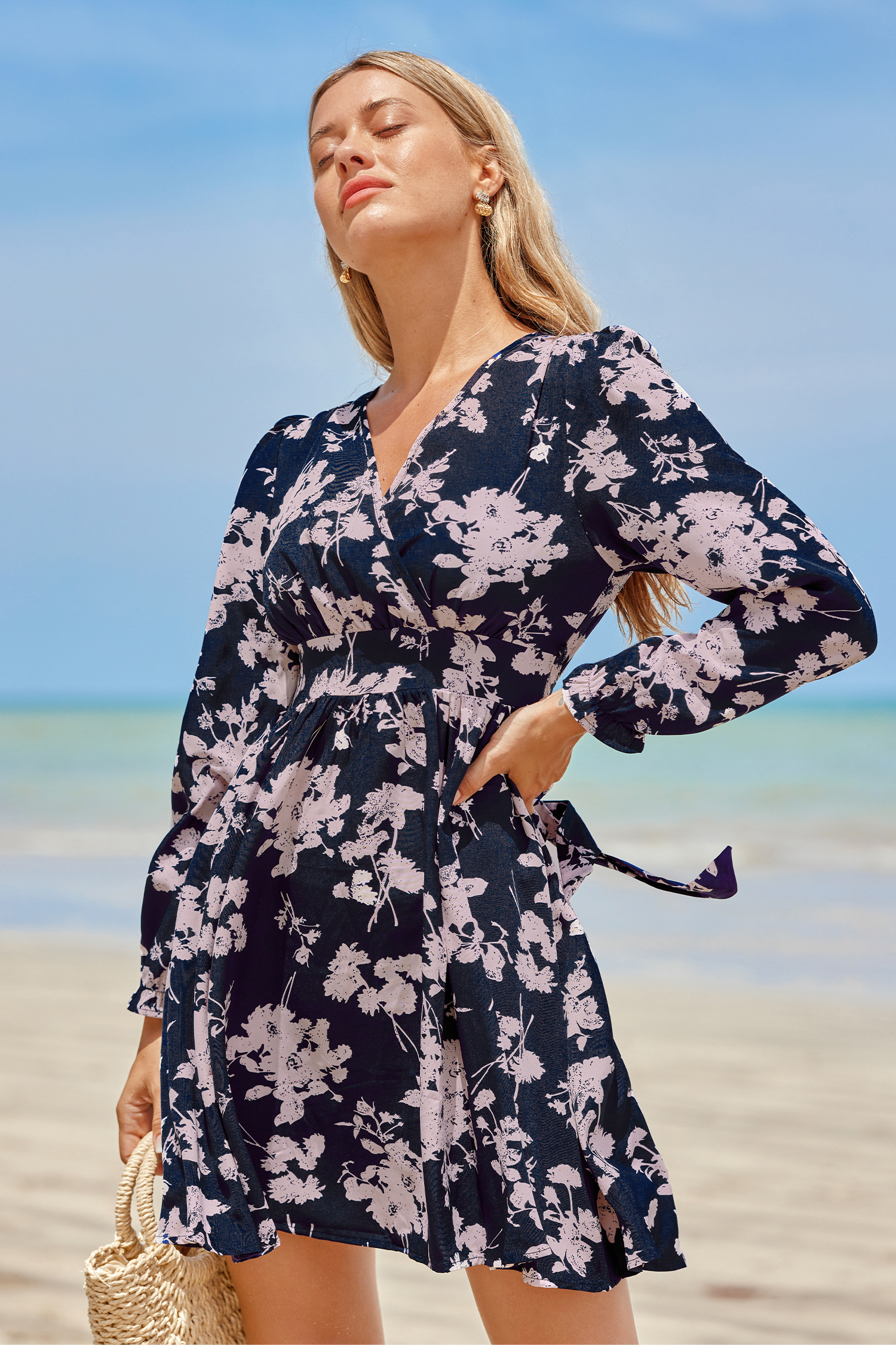 Marineblauwe en roze mini-jurk met bloemensuperplie