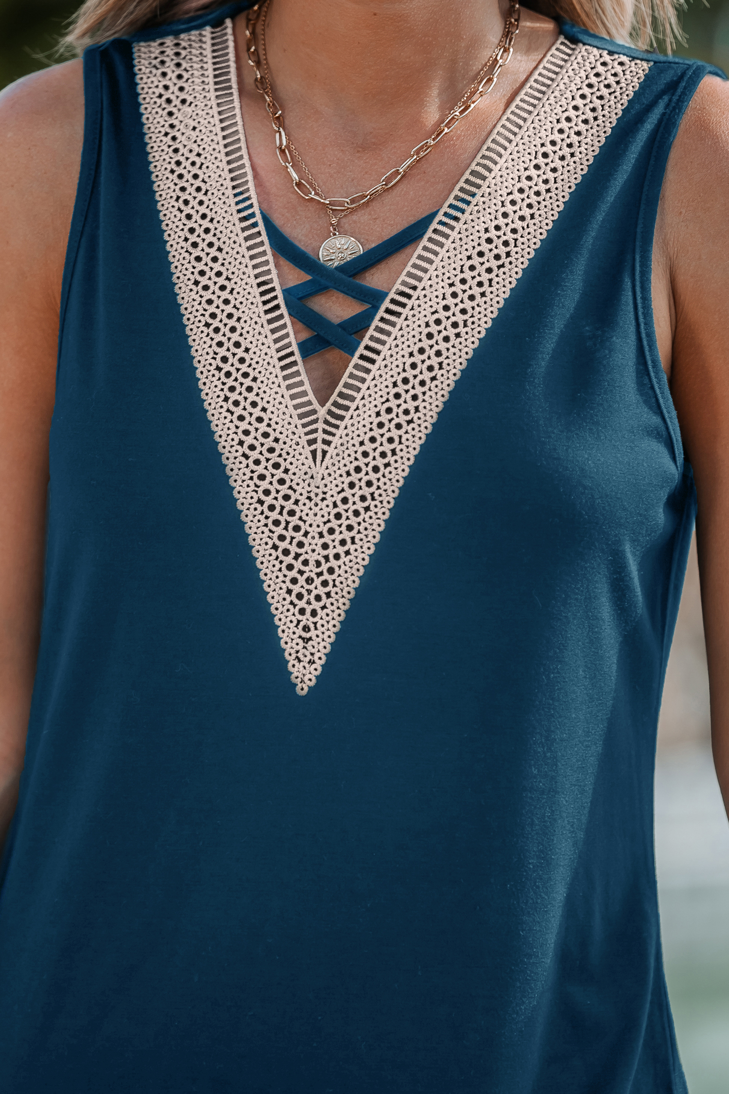 Marineblauwe mini-jurk met gekruiste bandjes en V-hals