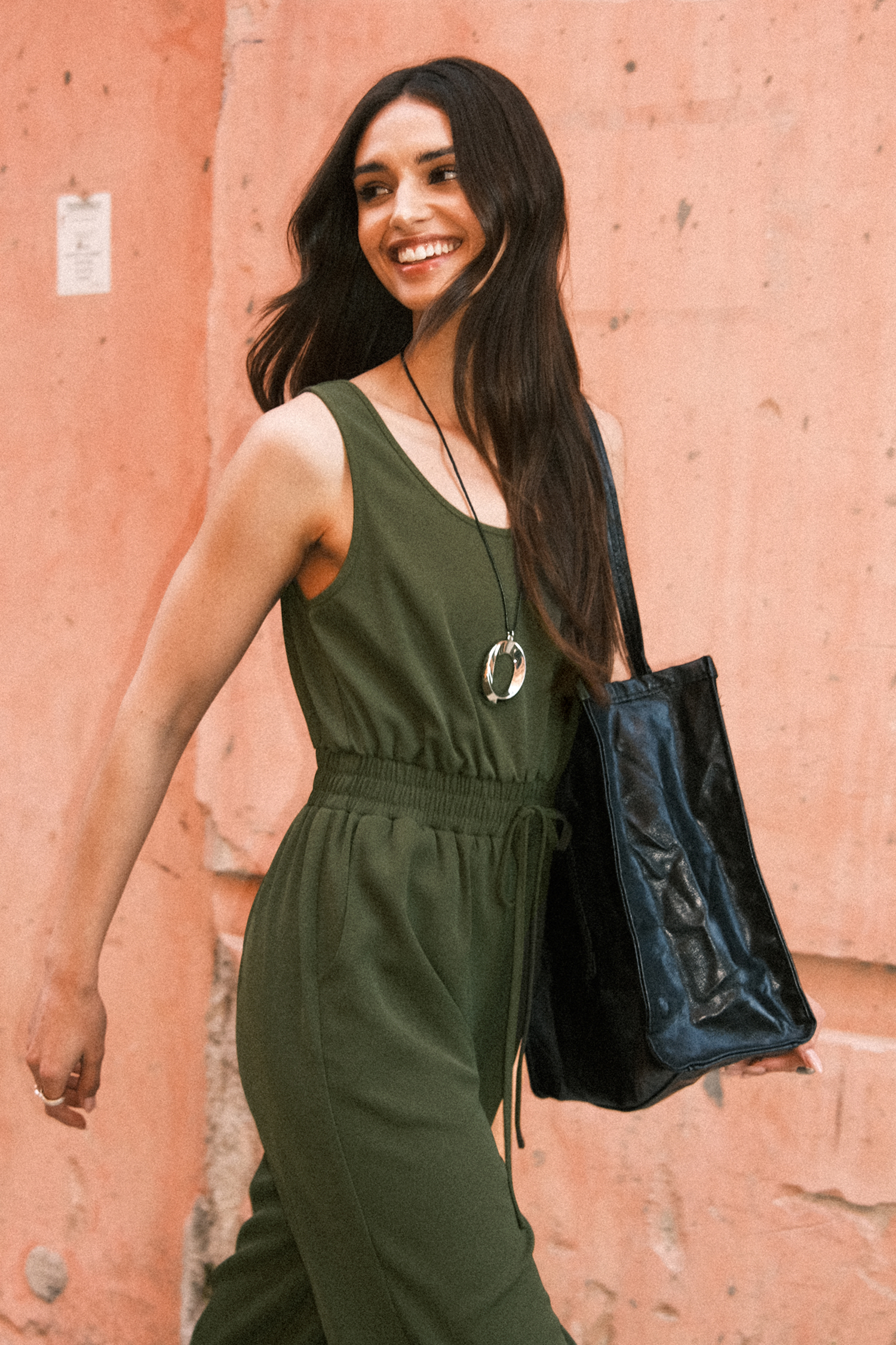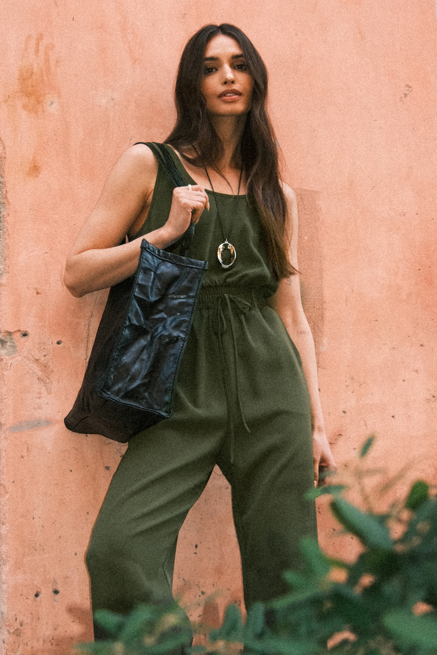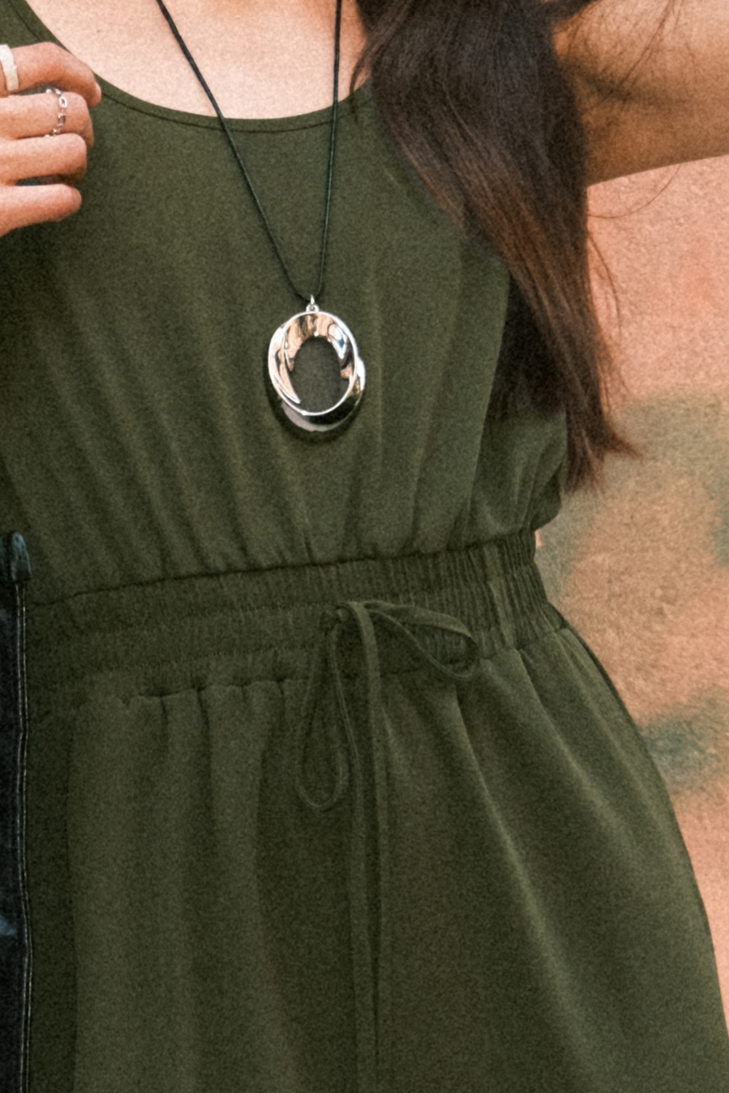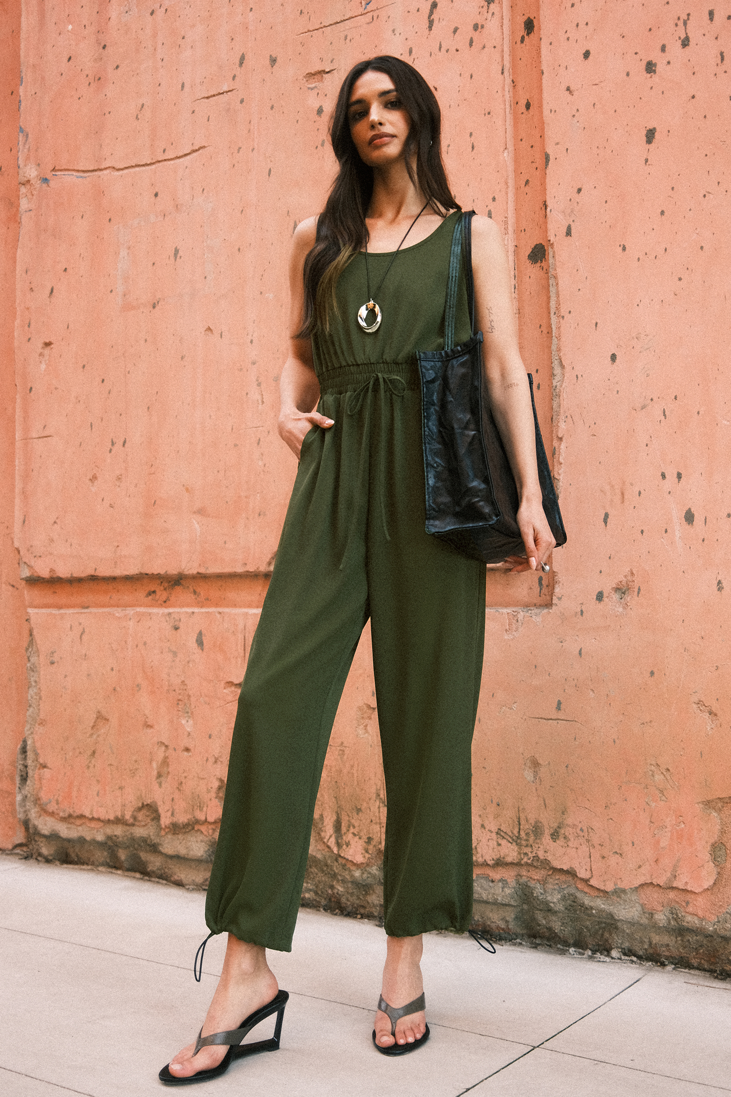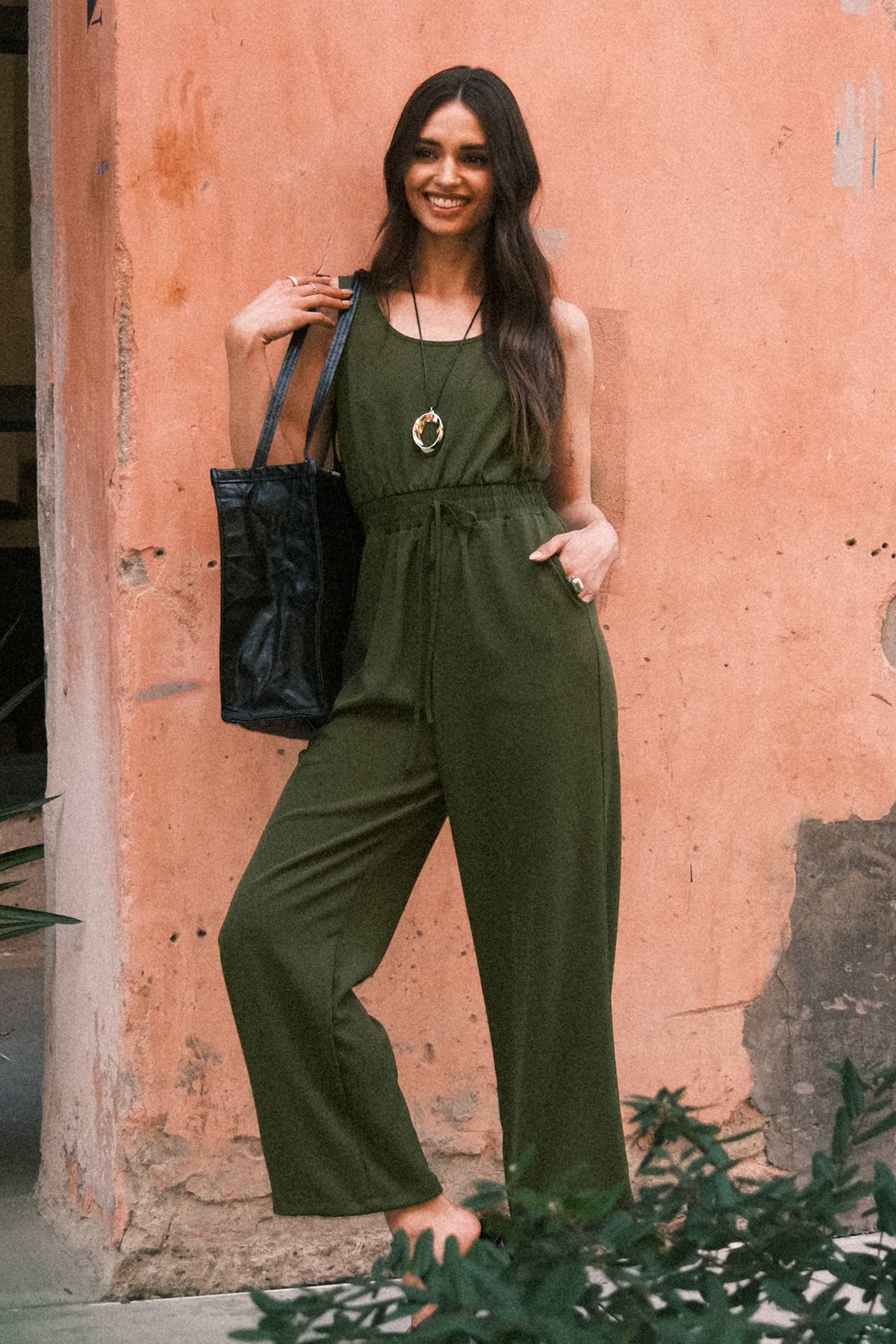 Olijfgroene mouwloze jumpsuit met ronde hals en rechte pijpen
