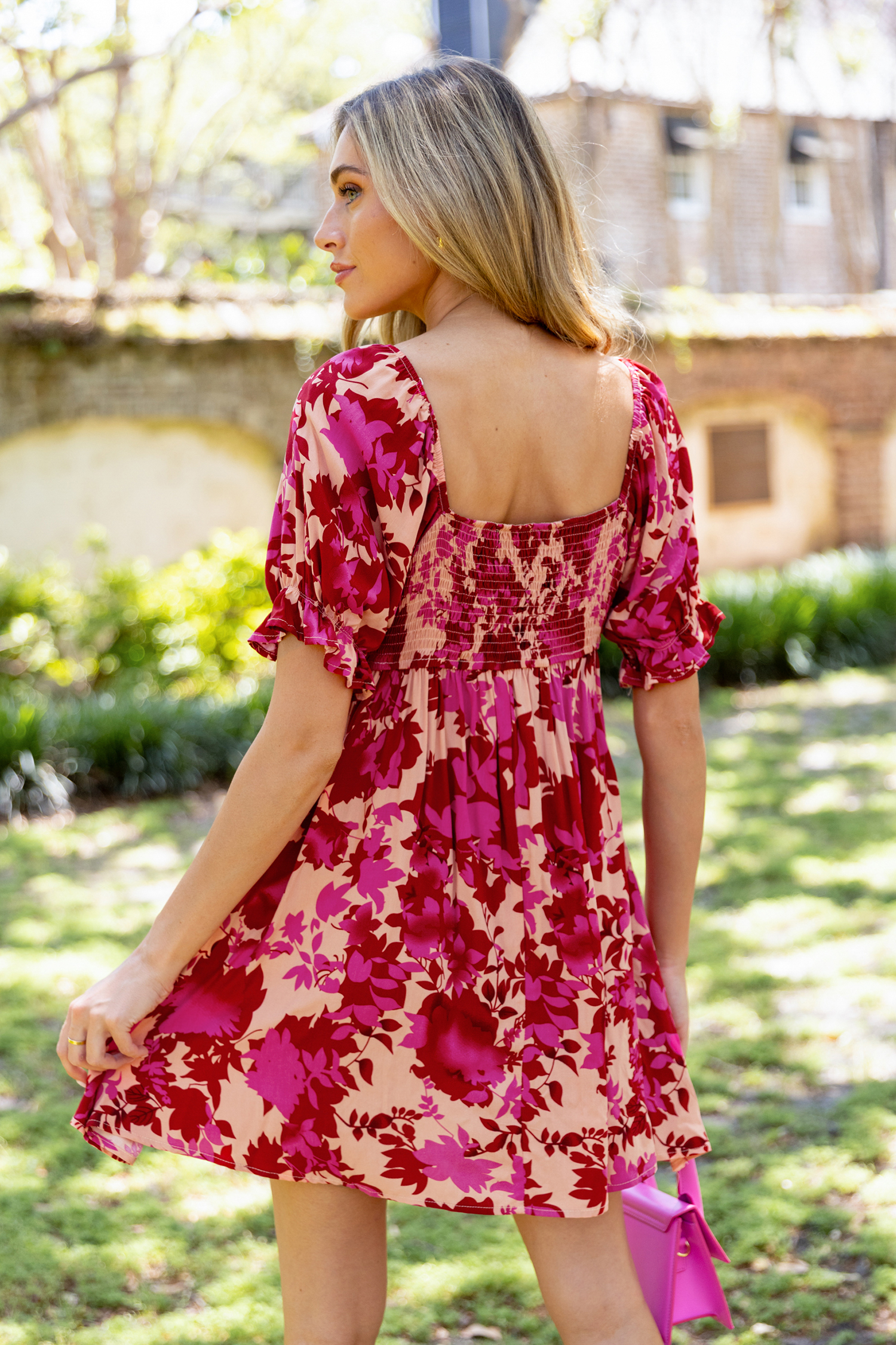Roze en rode mini-jurk met vierkante hals en ruches met bloemen