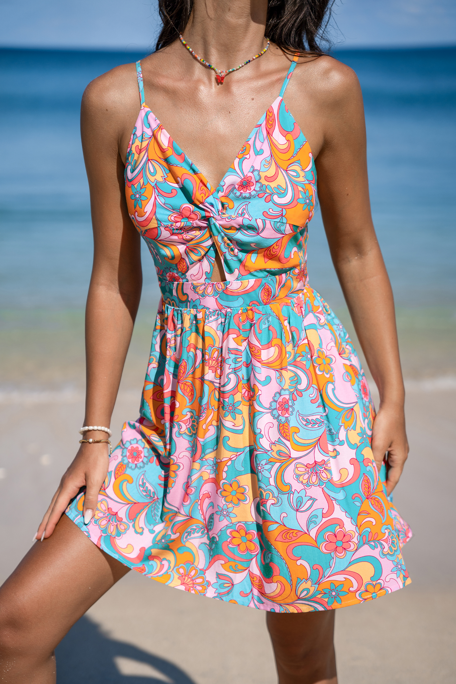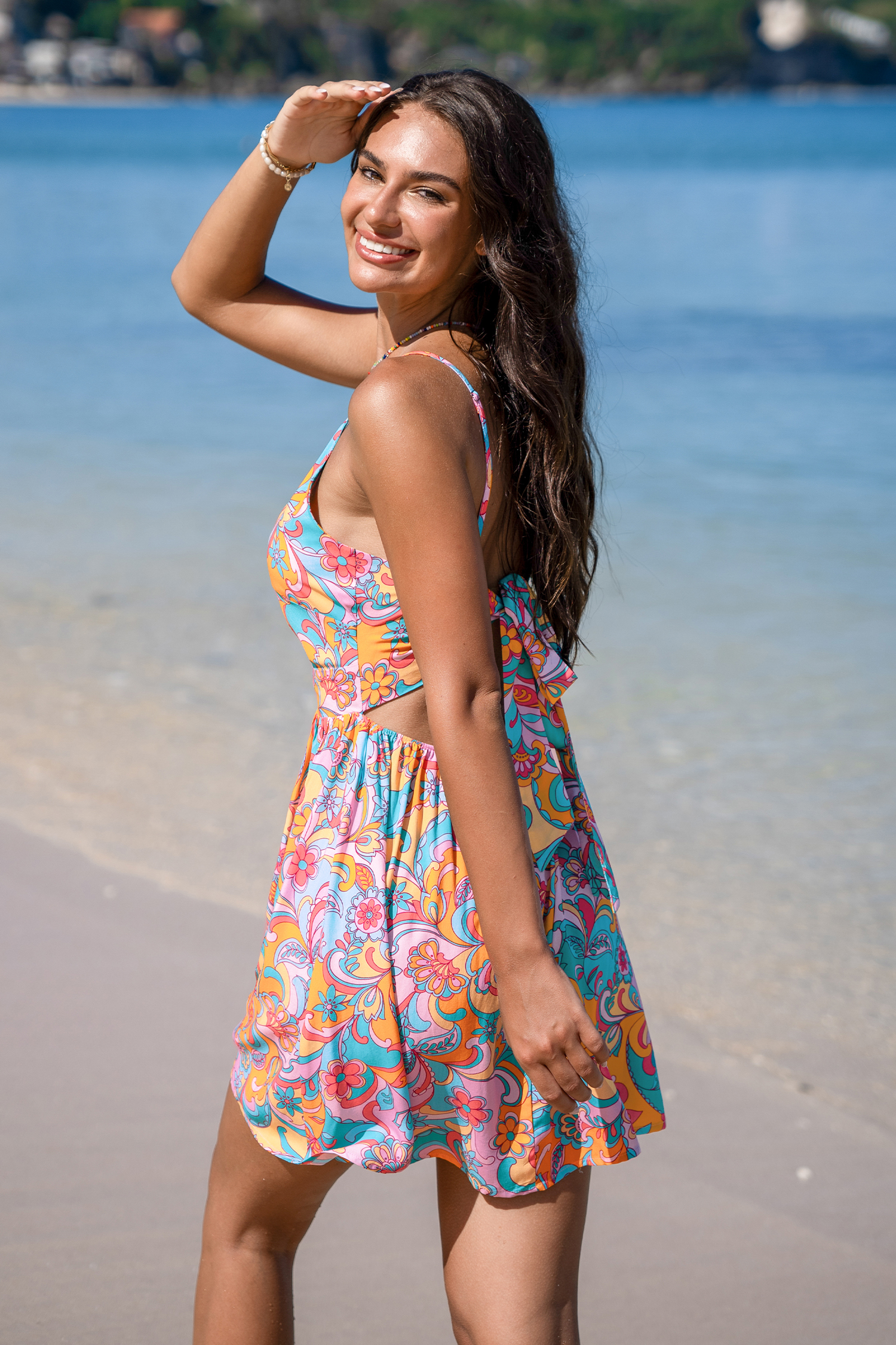 Mini-jurk met retro bloemendas en uitsnijding op de rug