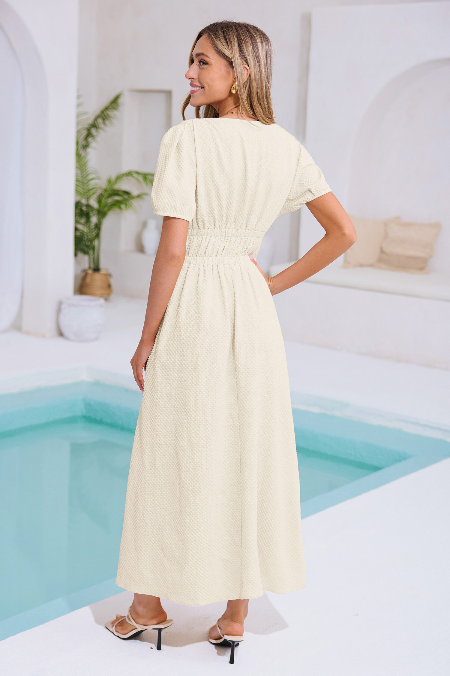 Romantische zachte gele maxi-jurk met pofmouwen