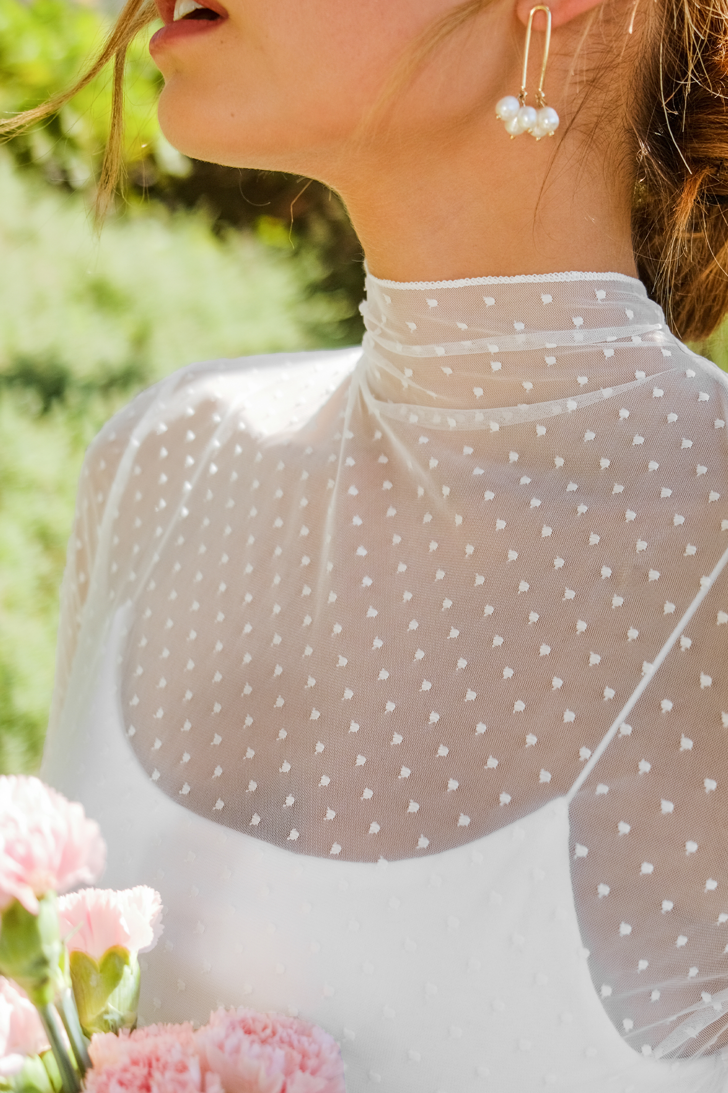 Doorschijnende witte Mockneck top met lange mouwen en Zwitserse stip