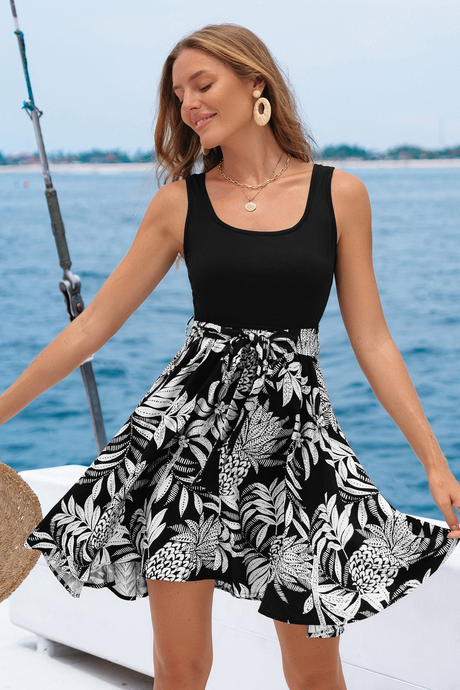 De Sunset Escape Tropical Mini Dress is jouw go-to voor een moeiteloze tropische look! Deze mini heeft een flatterend vierkante halslijn mouwloos design en een tailleband voor de perfecte pasvorm.