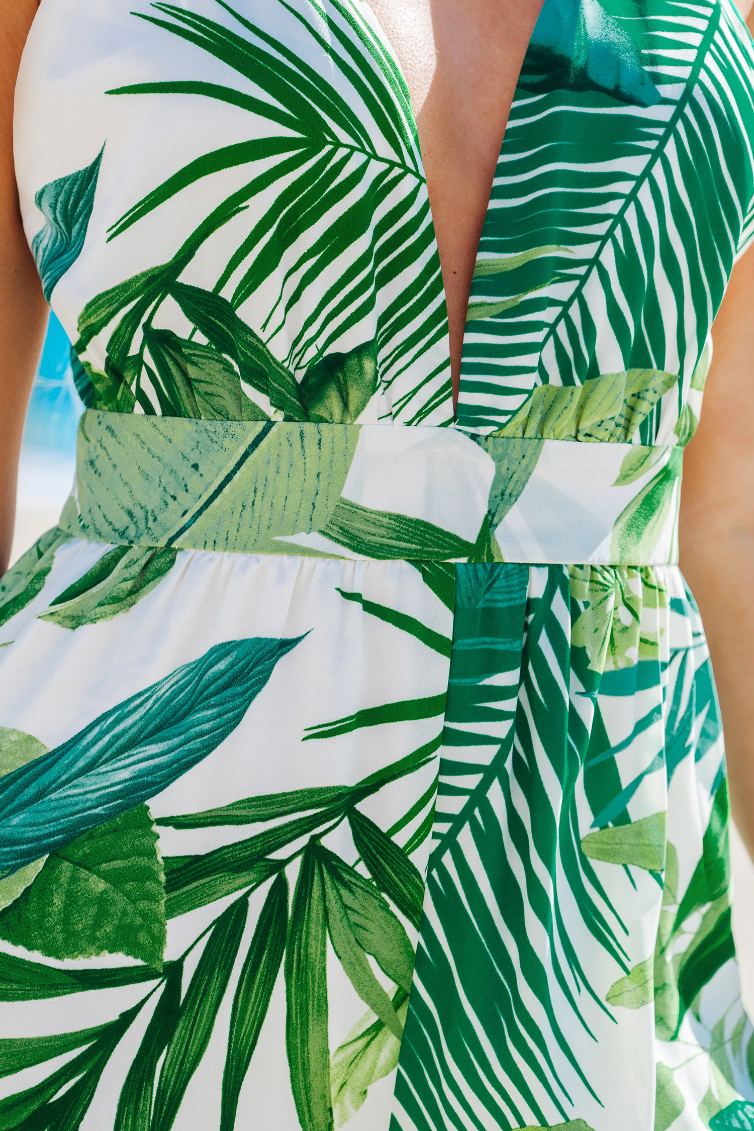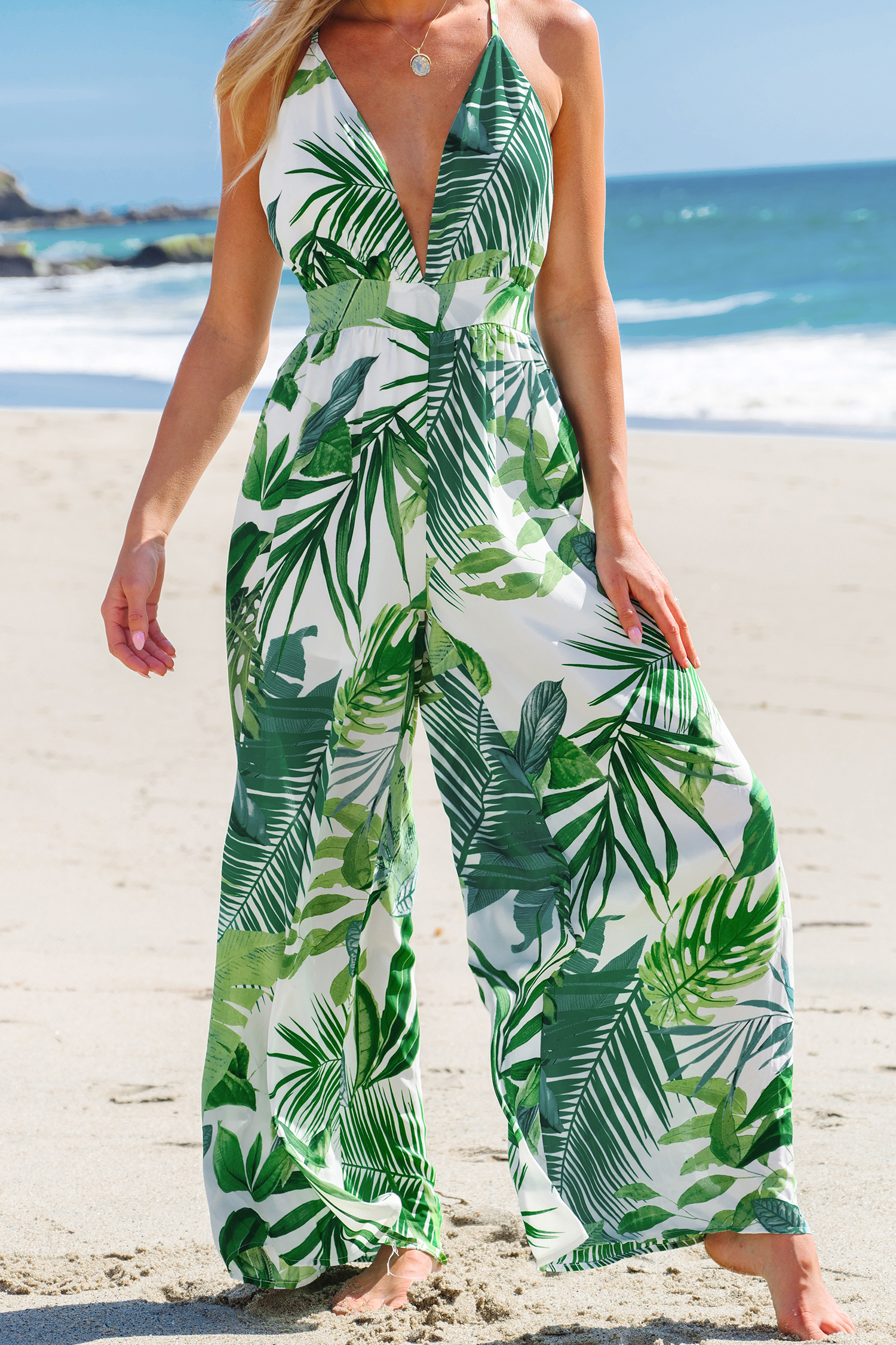 Tropische diepe mouwloze jumpsuit met wijde pijpen