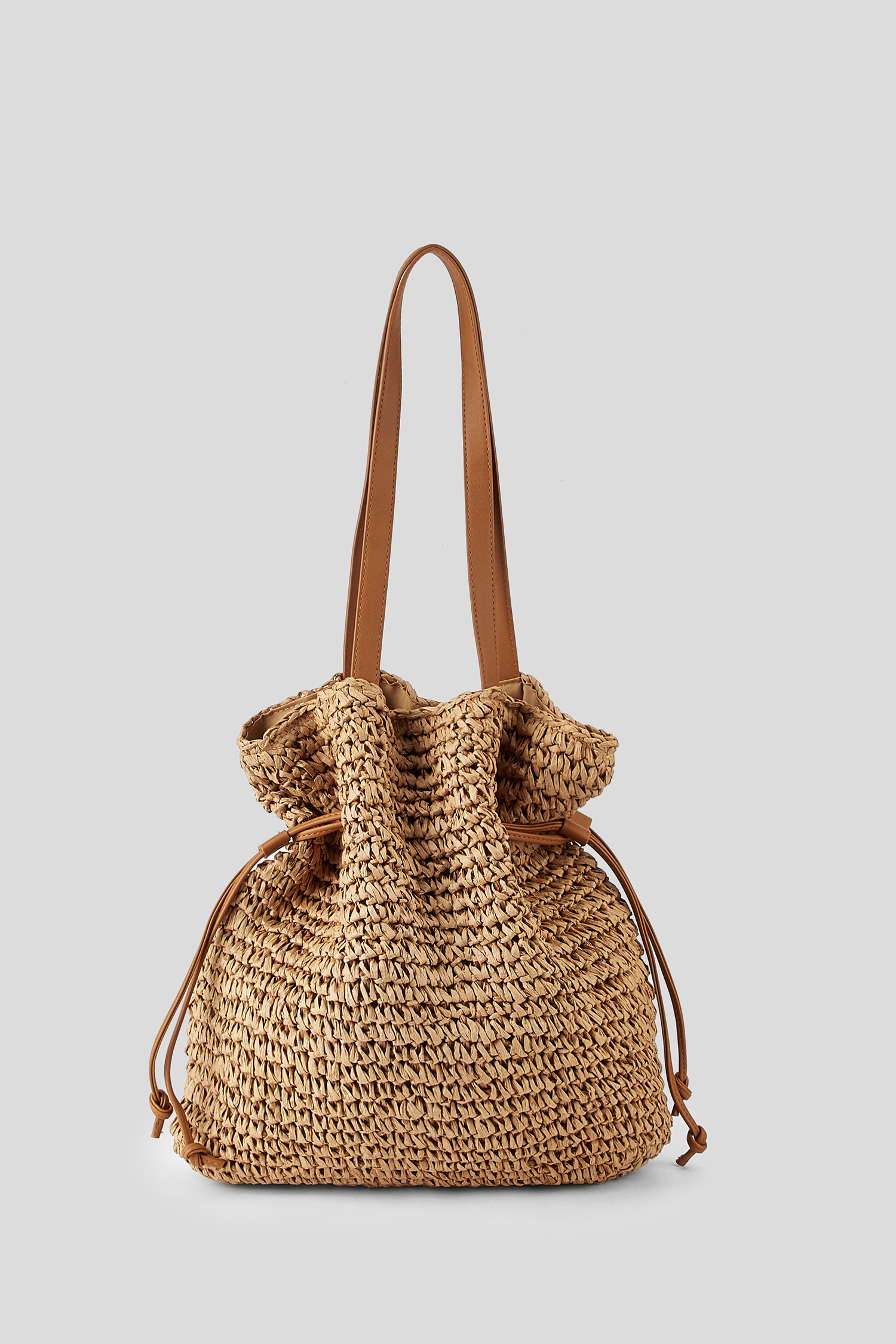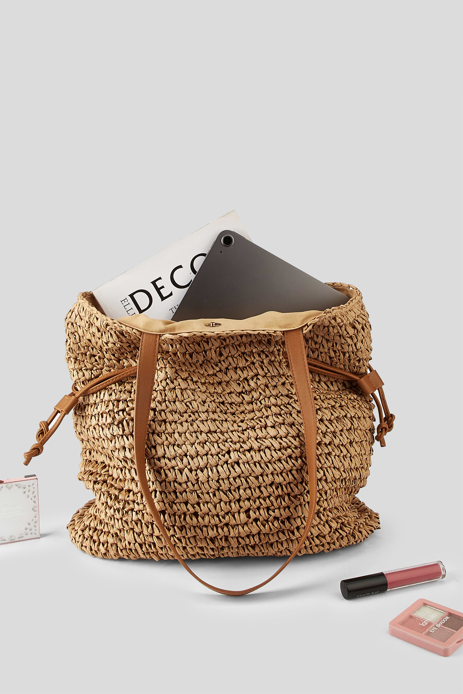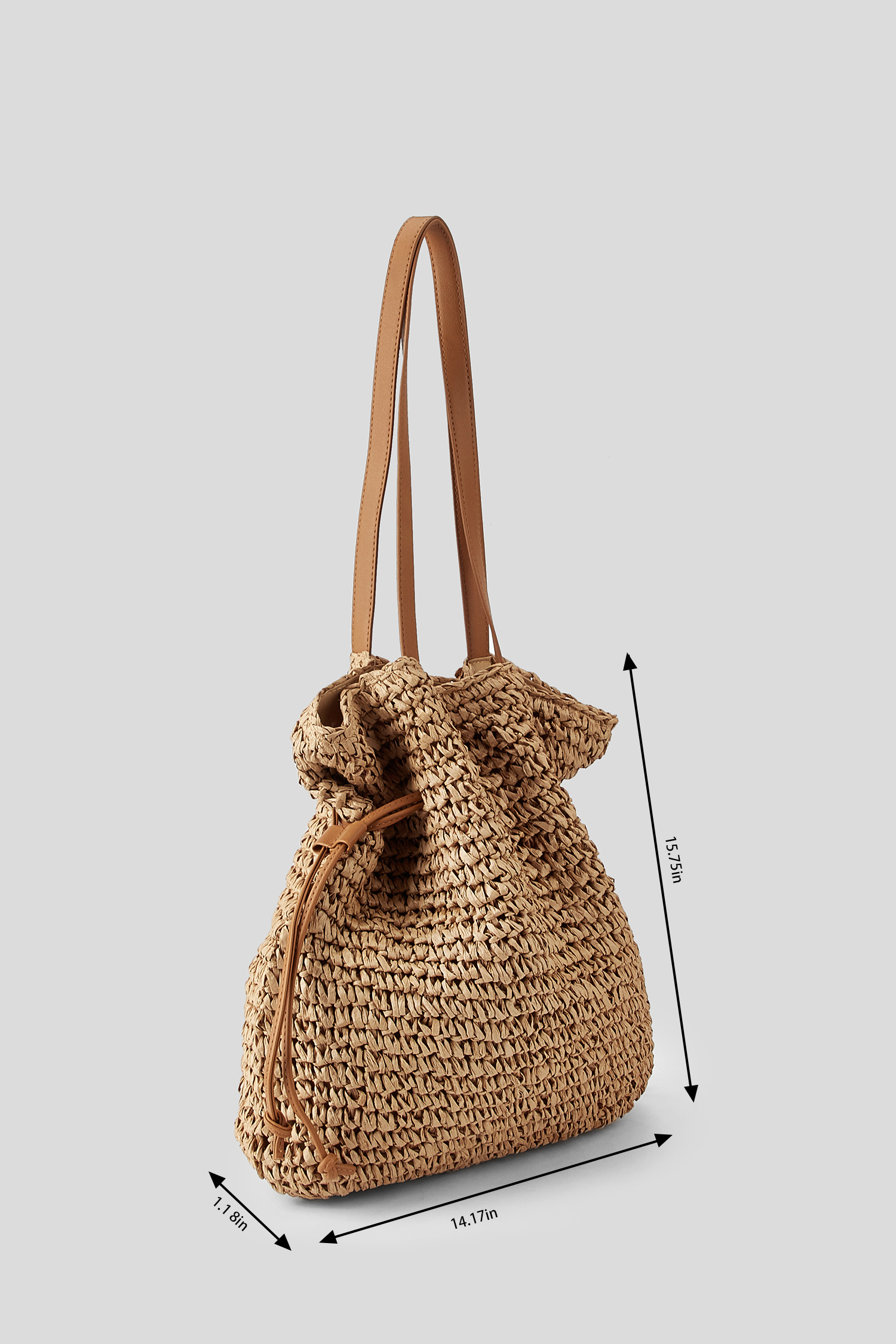 De Tropical Tidepool Straw Bag is leuk en makkelijk mee te nemen voor elk strandavontuur! De emmervorm met trekkoordsluiting en schouderband houdt je essentials veilig en voegt een relaxte, stijlvolle touch toe.