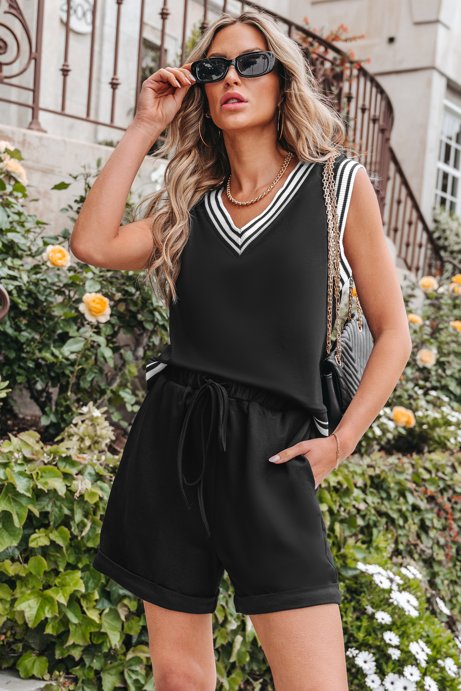 ThuisSet met tanktop en short met varsity-gestreepte v-hals