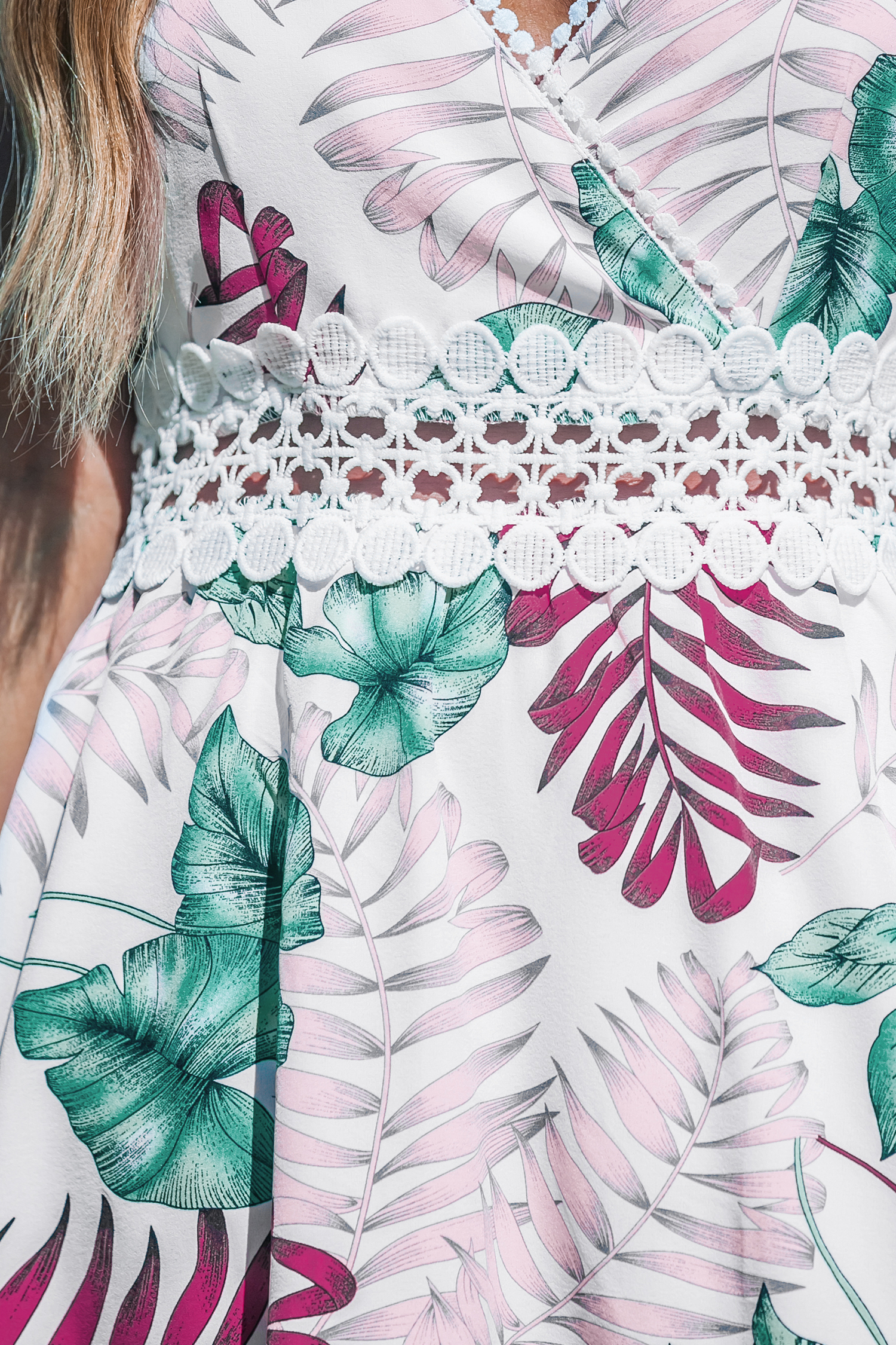 Witte mouwloze mini-jurk met tropische bladeren