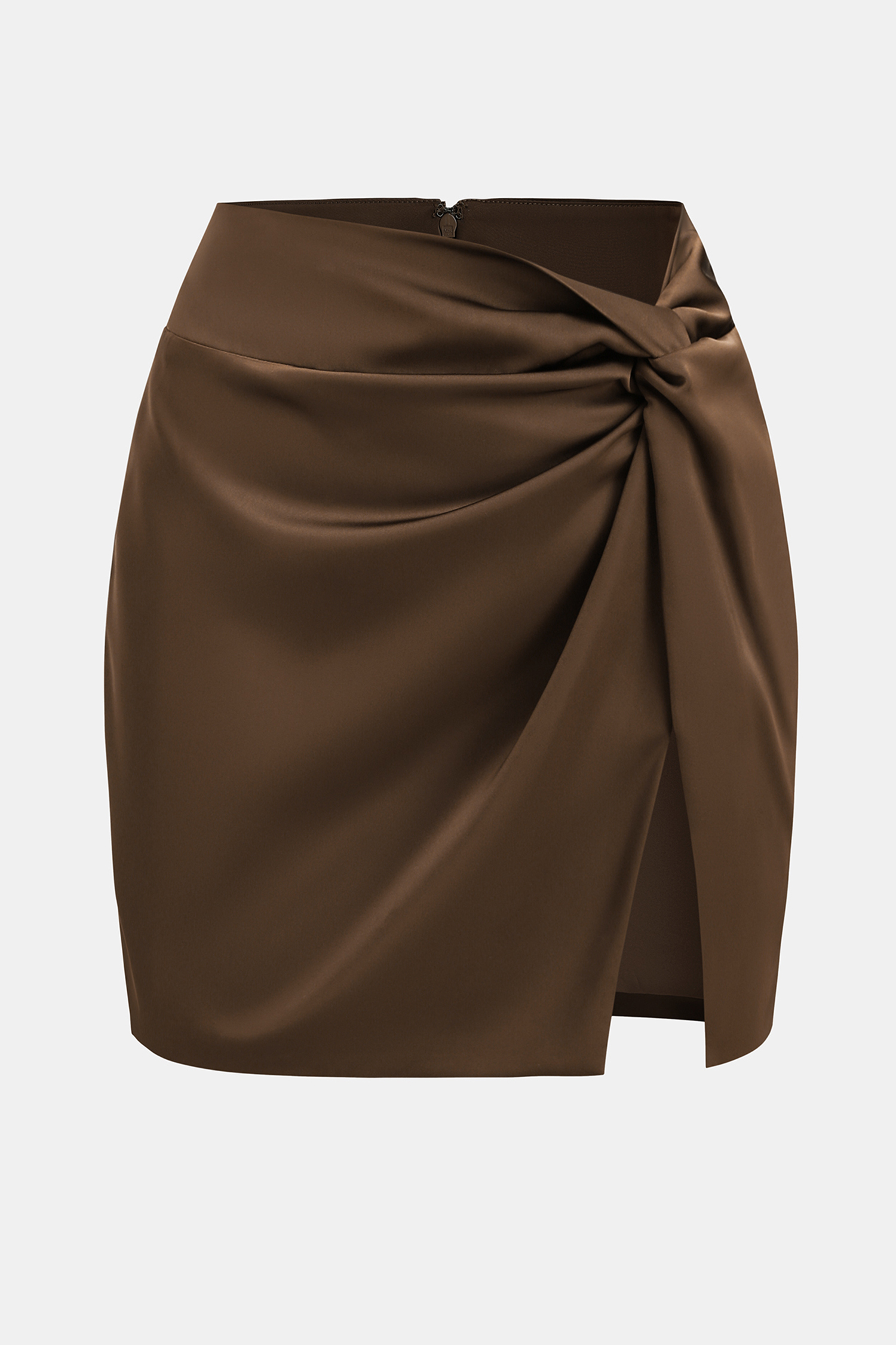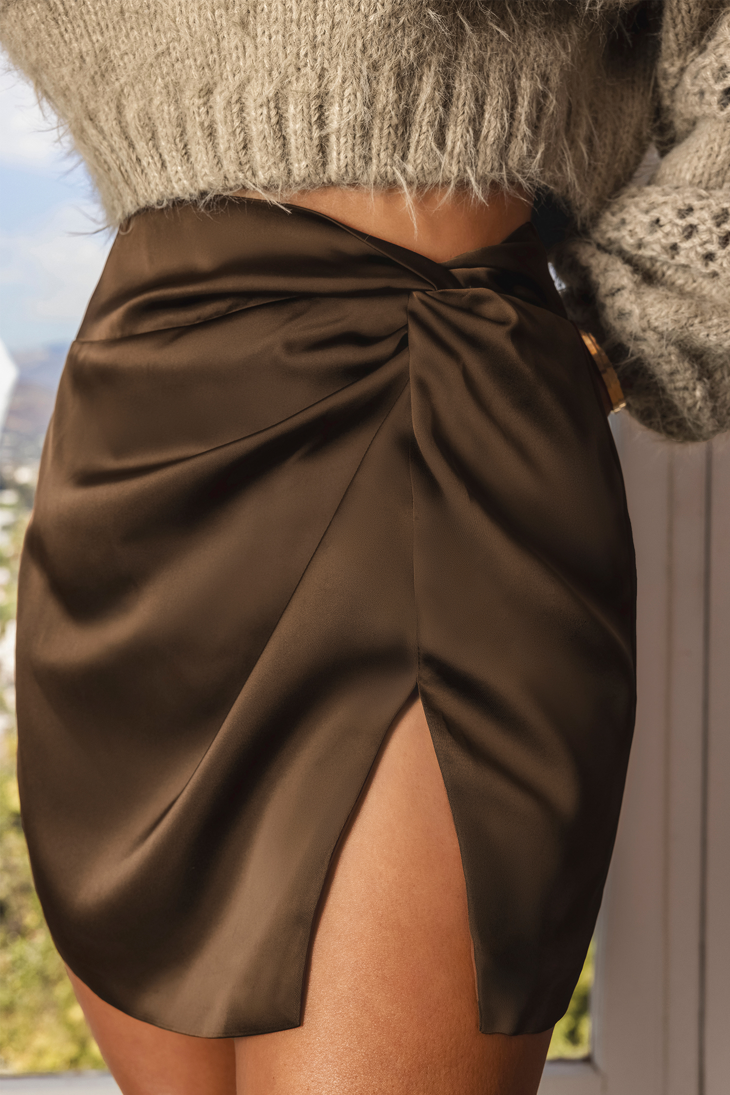 De Espresso Twist Satin Minirok is je ultieme partygenoot voor feestdagen. Deze minirok is perfect geweven en heeft een stijlvolle twist in de taille die een speels tintje aan je look toevoegt. De gekartelde zoom zorgt voor een speels randje, waardoor hij ideaal is om de hele nacht te dansen met vrienden.